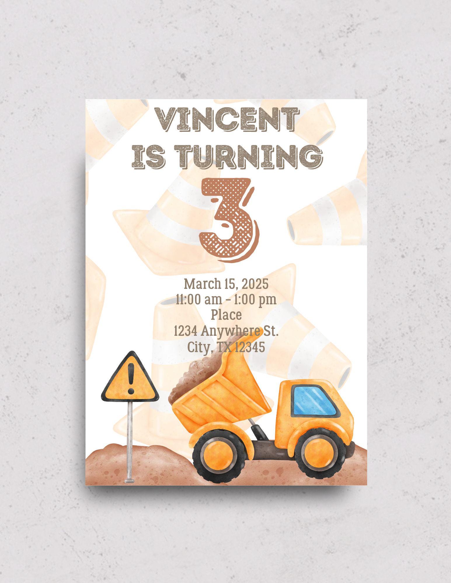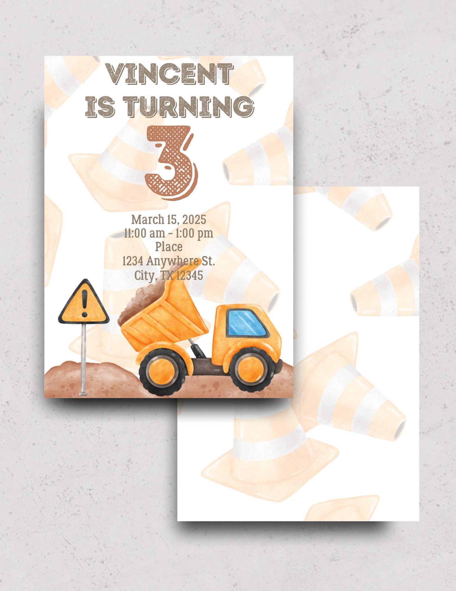 Construction and trucks is what little boys dream of. This birthday is going to be a dirt load of fun. Invite friends with this custom editable 5x7 custom birthday invitation.