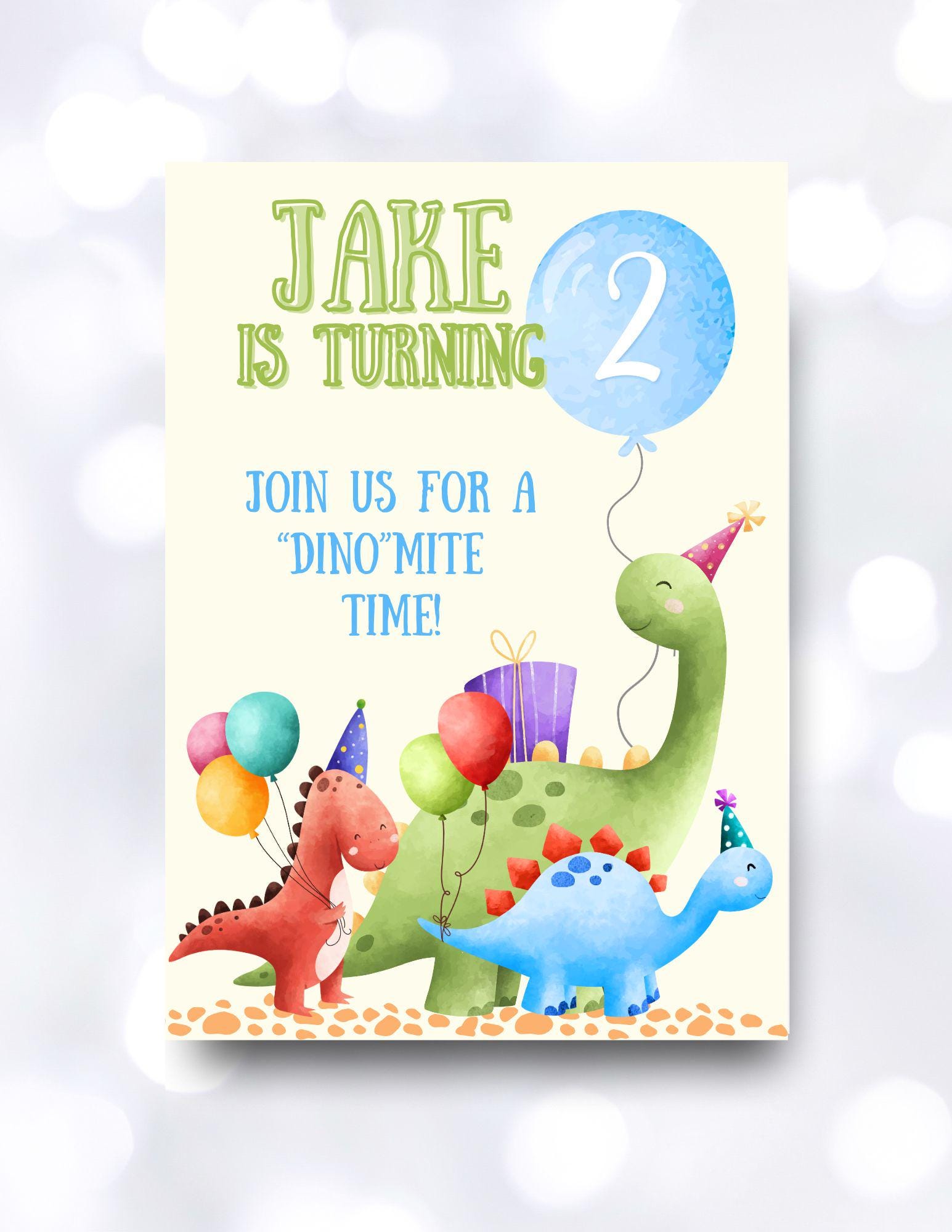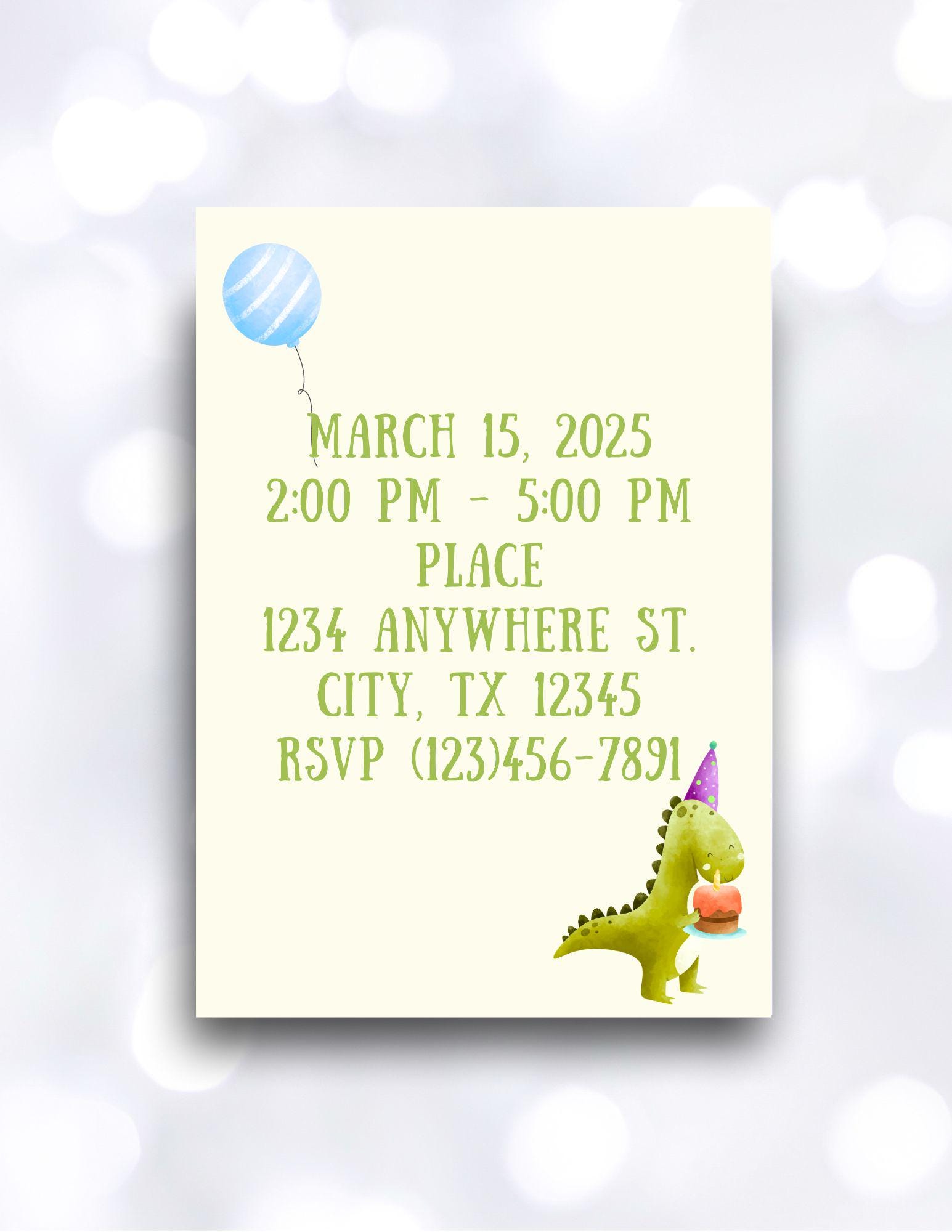 Little Dinosaurs stomping around with Balloons! Who says dinosaurs can't join the party. Two sided custom watercolor invitation. Edit this 5x7 custom invitation with your own details.