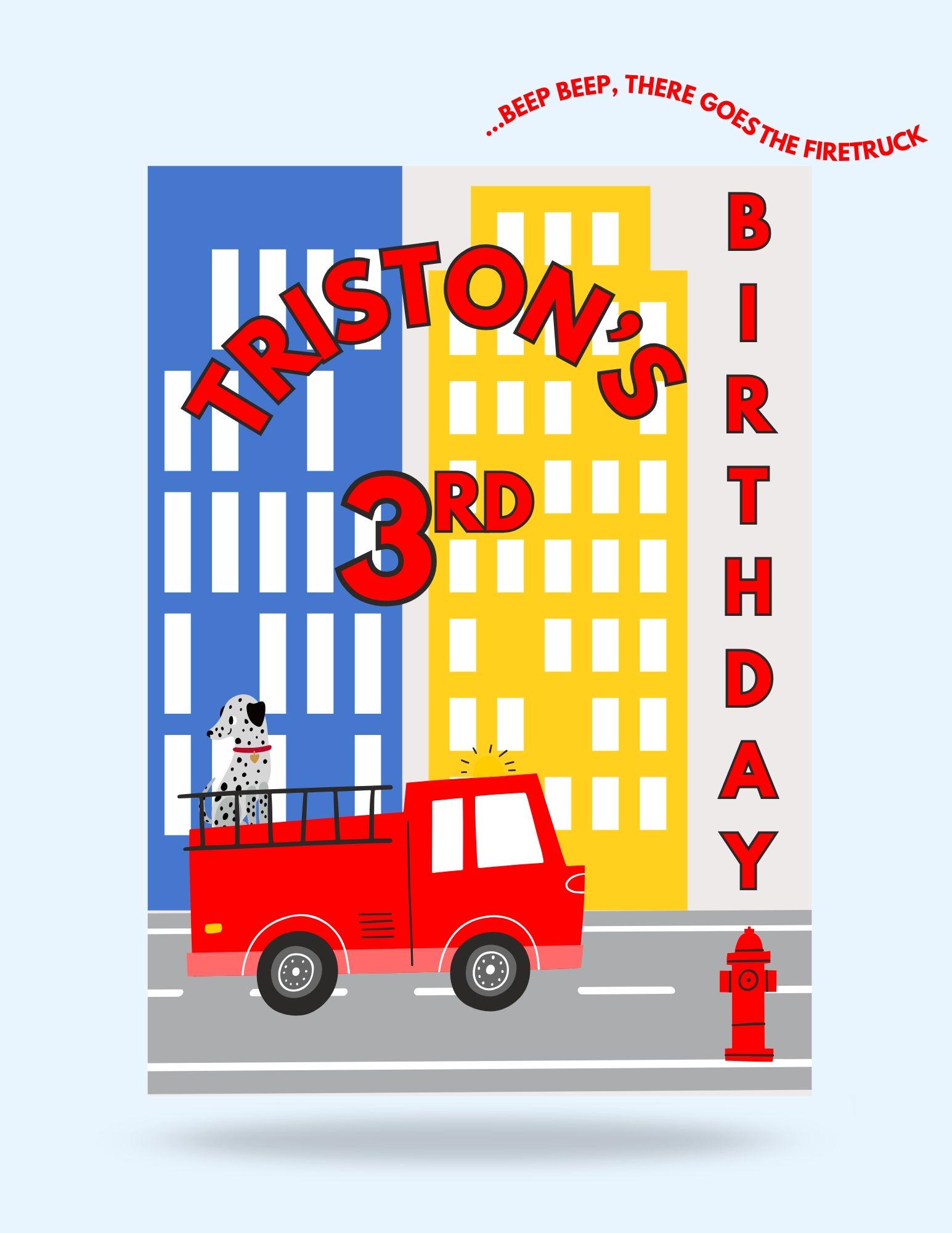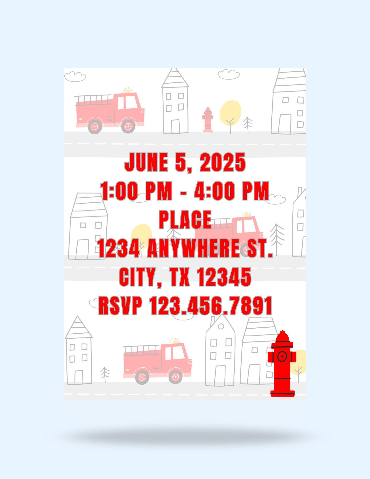 Vroom vroom there goes the firetruck! Firetruck, dalmatian's, and a party! Edit this 5x7 custom invitation with your own details.