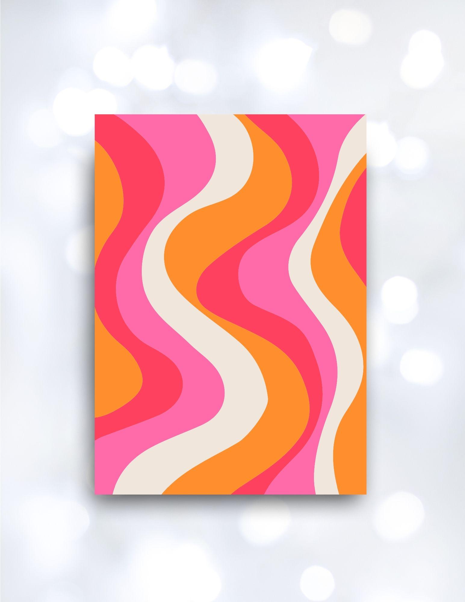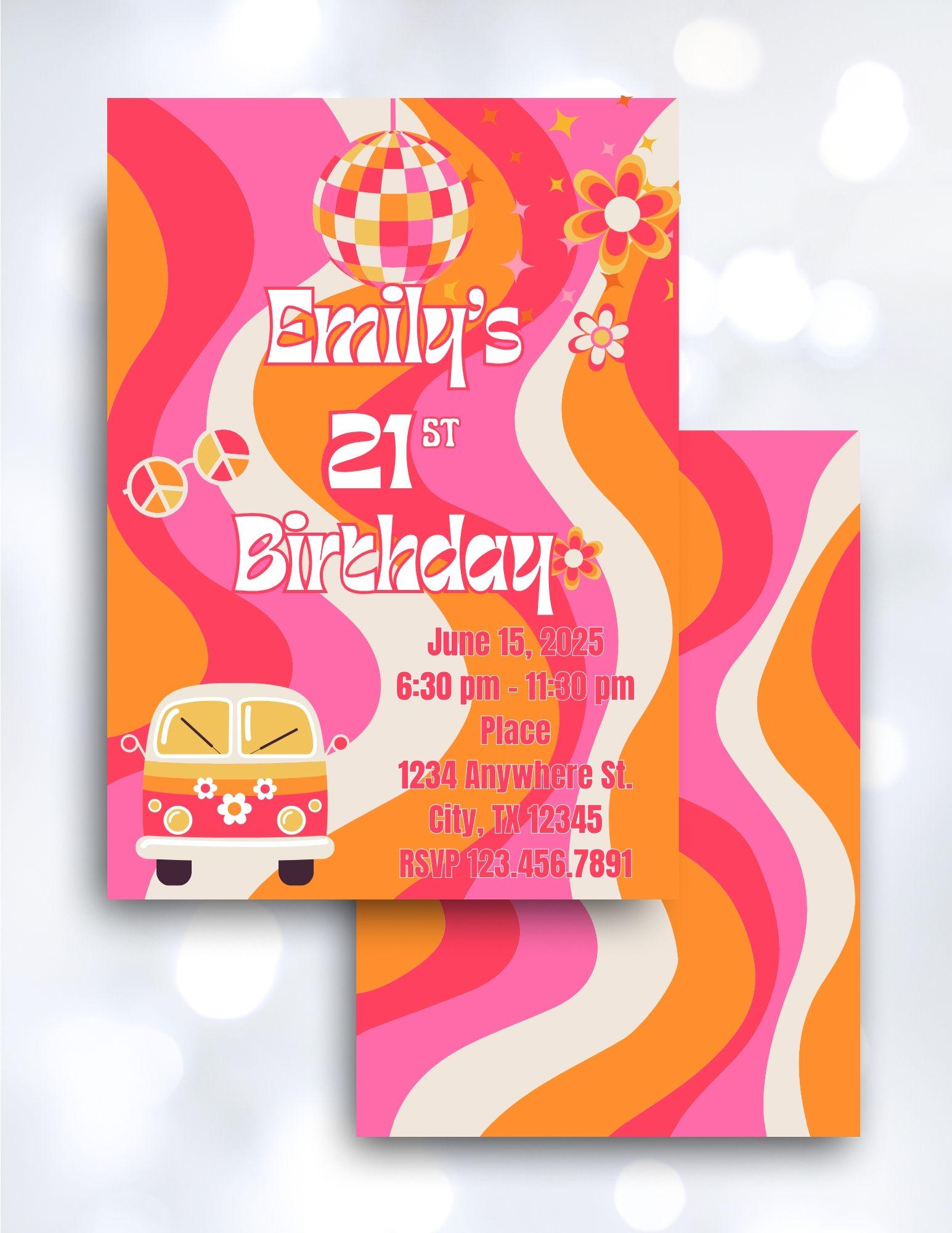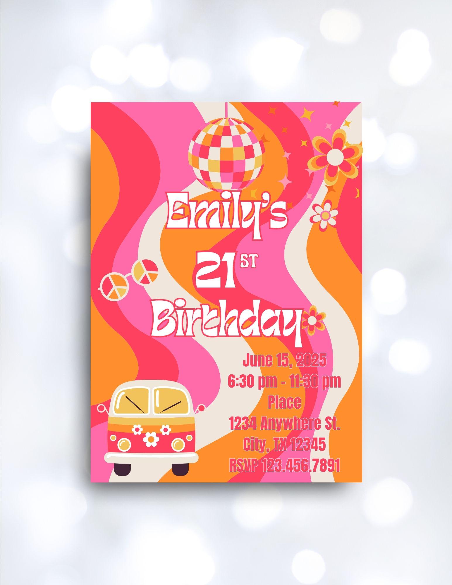 Groovy, pink wavey, disco party invitation. Edit this 5x7 custom invitation with your own details.