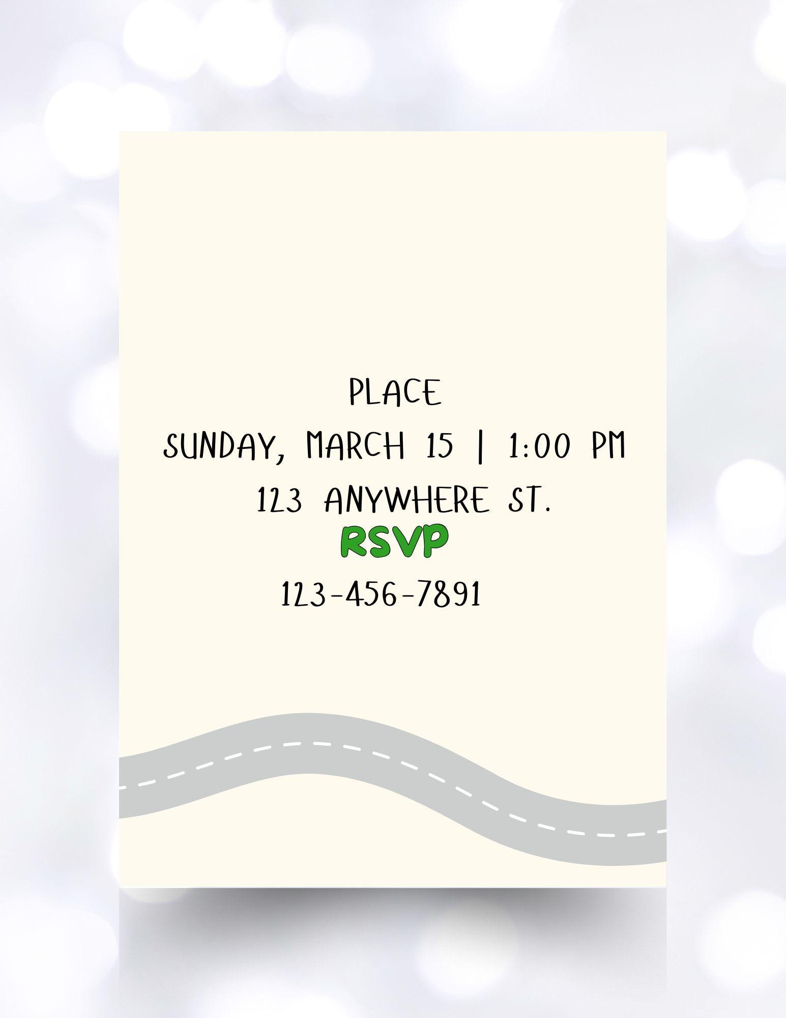 Vroom vroom, it's a race! Let's race to the finish line and have cake! Edit this double sided 5x7 custom invitation with your own details.