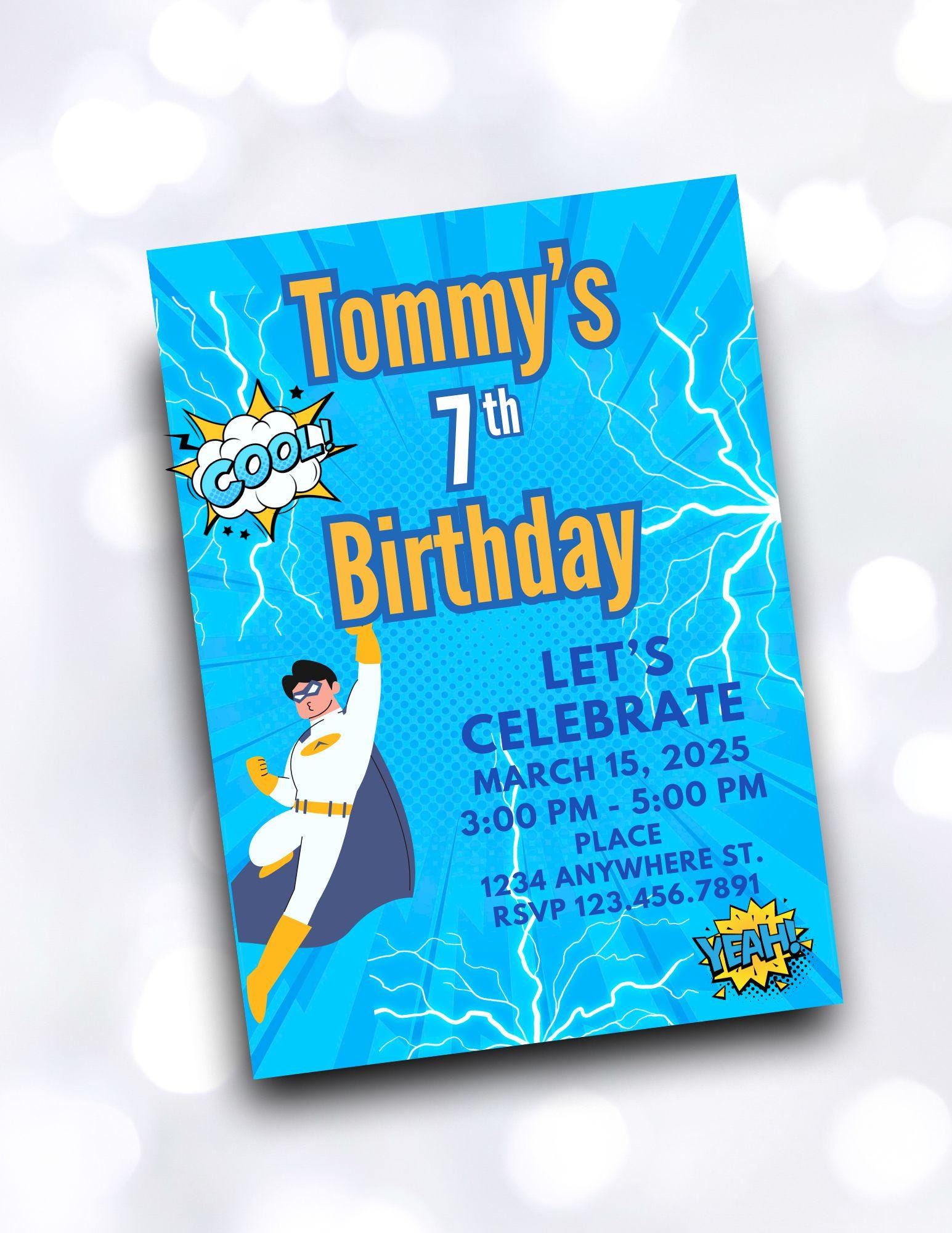 Calling all superhero's to come to a super birthday party! Edit this 5x7 custom invitation with your own details.