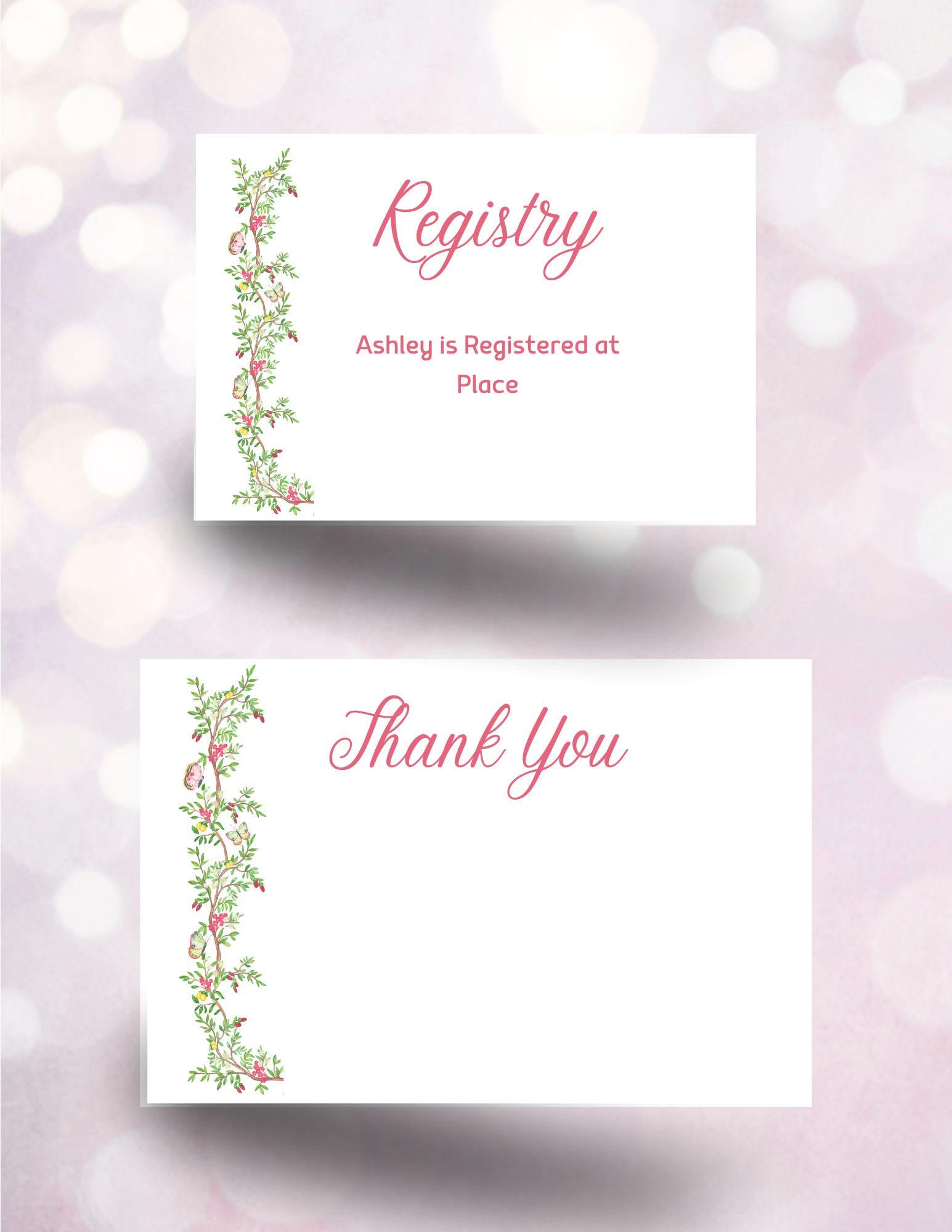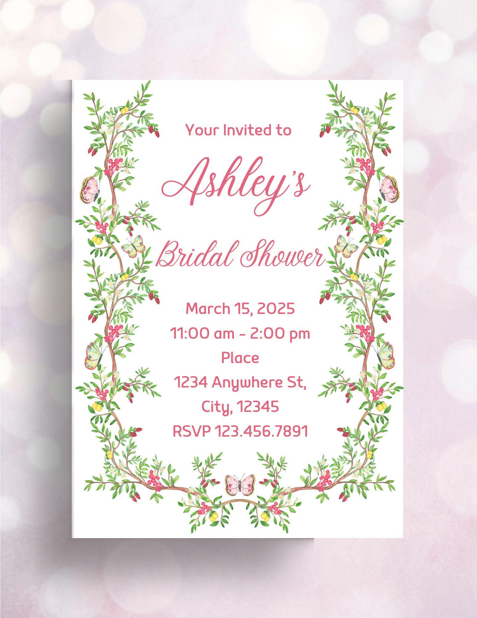 Love is in the air. Butterflies and flowers border makes this invitation standout. Edit with your own details. Includes download for invitation, registry and thank you cards.