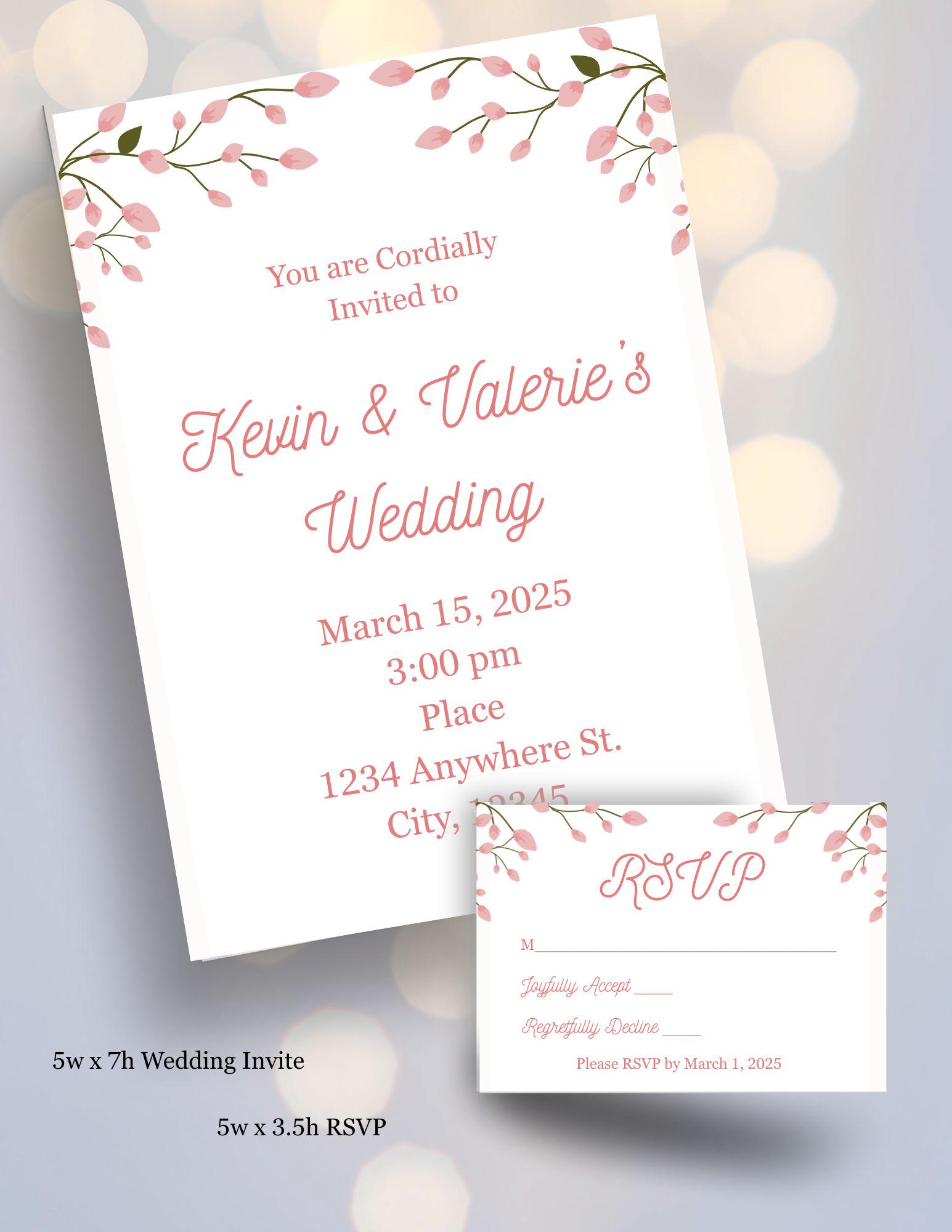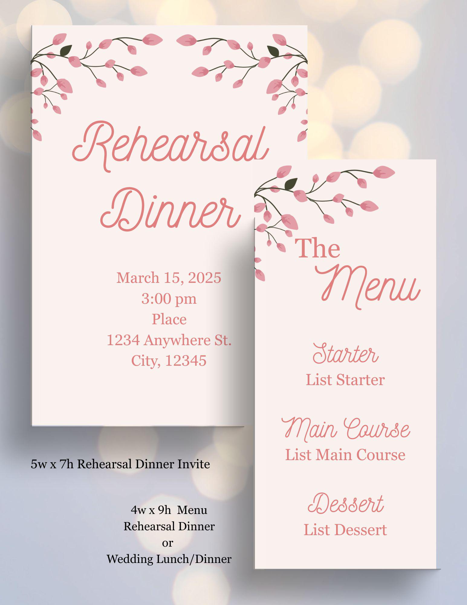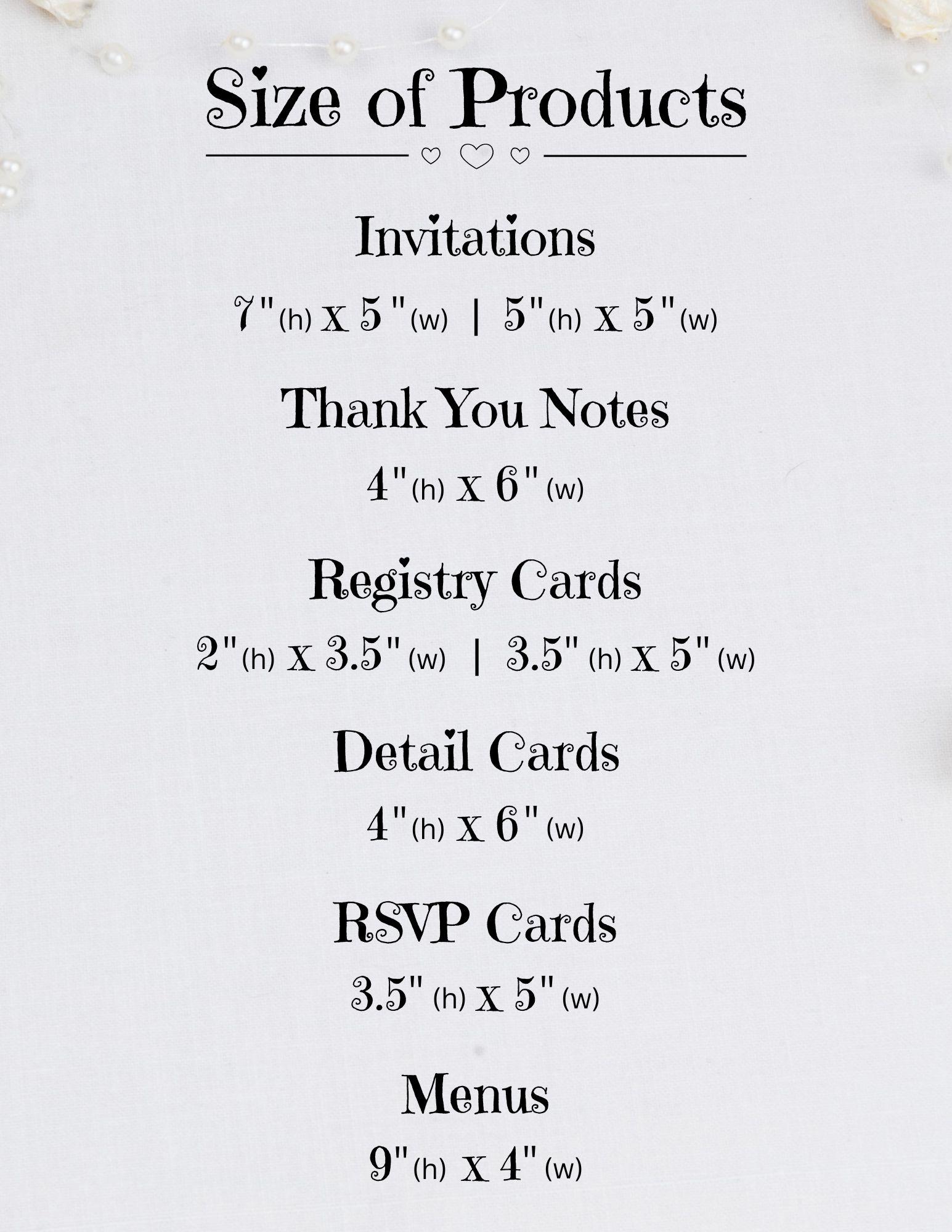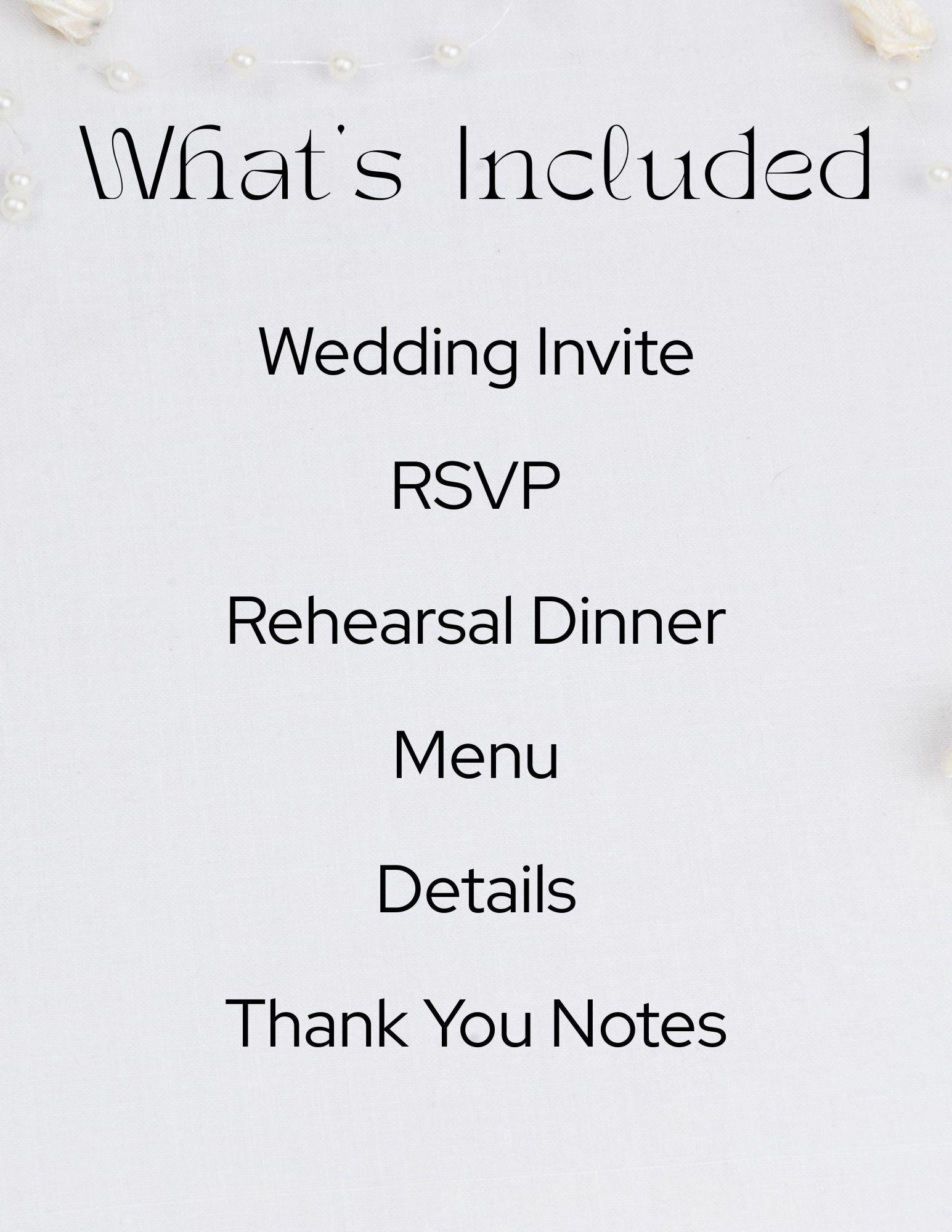 A sweet wedding invitation for a sweet couple. The rehearsal dinner invite and menu front and back are a different color than the wedding invitation. This custom wedding set includes the wedding invitation, rehearsal dinner, lunch/dinner menu, RSVP card, wedding details card, and thank you card. Edit with your own details.