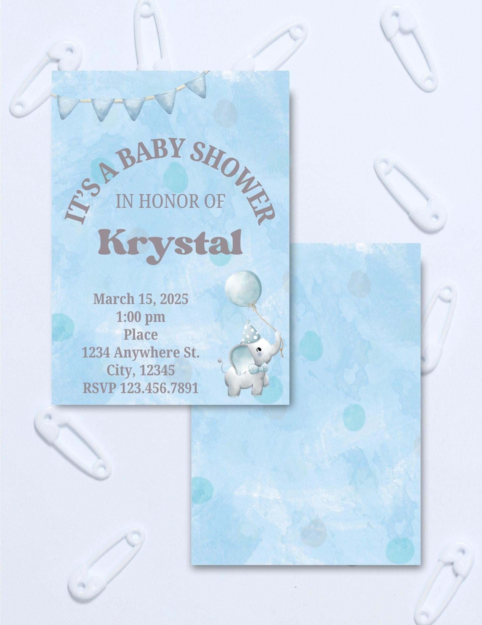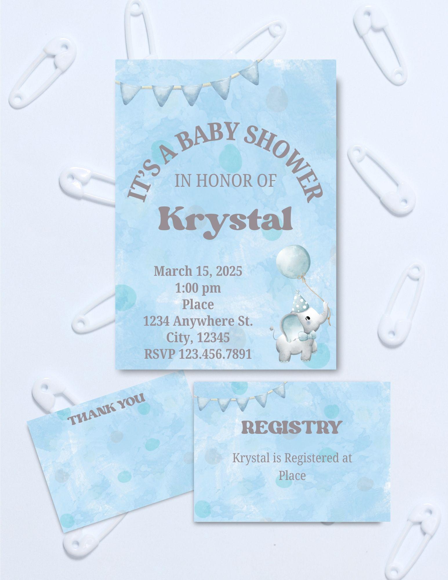 A little one is on the way.. Invite guests with this cute baby elephant and polka dots invitation. Edit this custom 5x7 digital invitation with your own details. Digital package includes invitation, registry card, and thank you card.