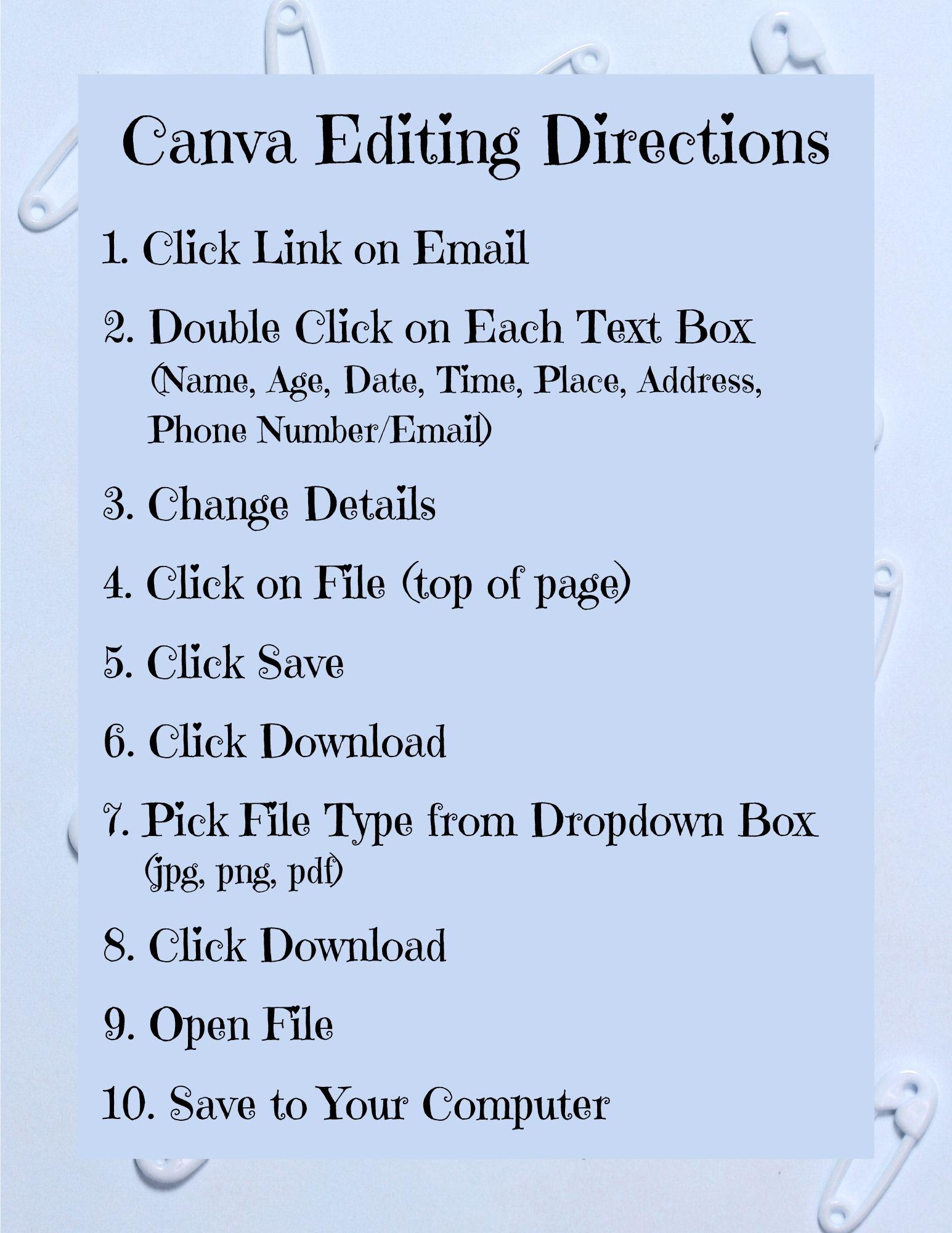 Name, Age, Date of Event, Time, Place, Address, RSVP (phone number, email, or both), Download Type (jpg, png, pdf) Notes if Any.