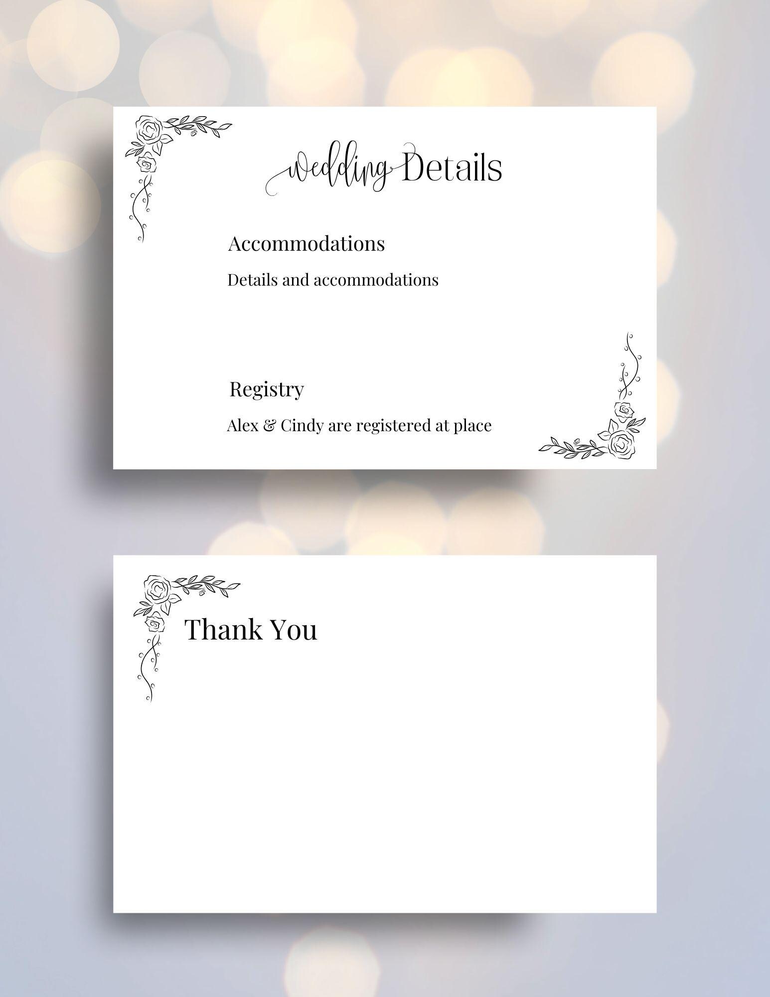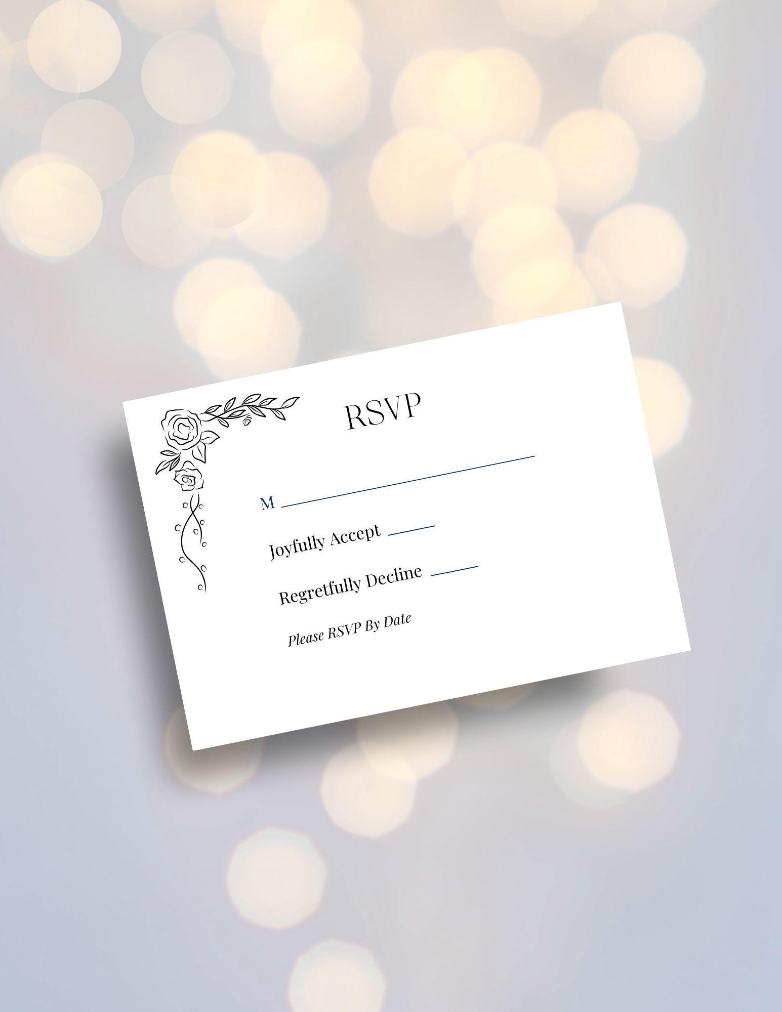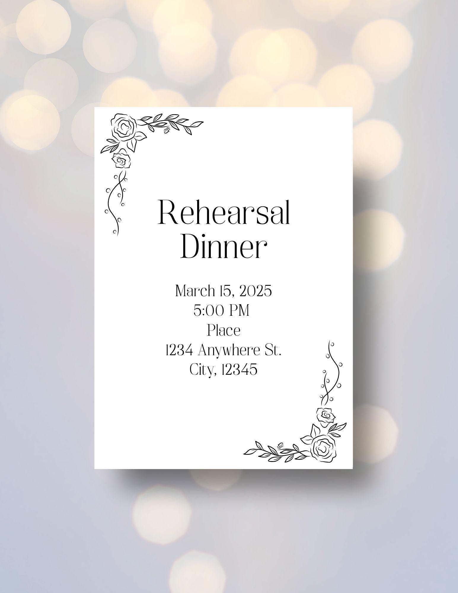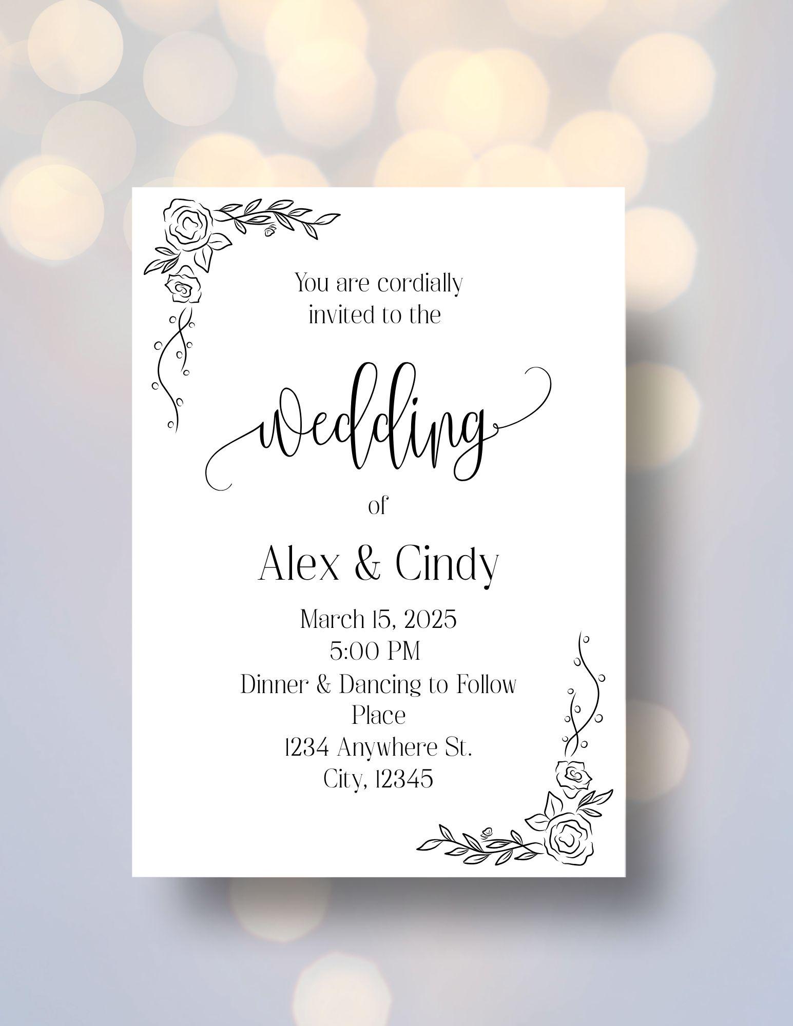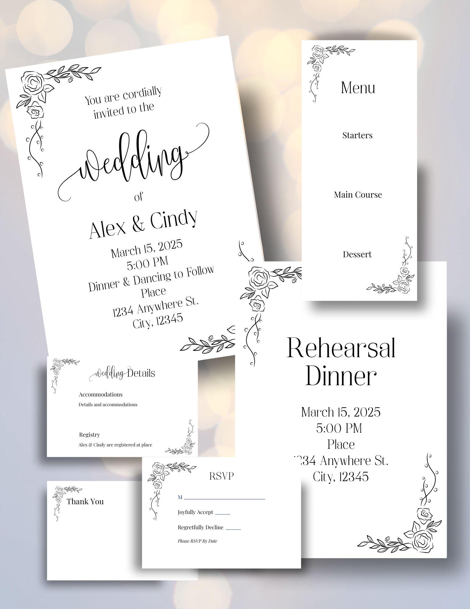 Invite guests to your wedding with this simple but elegant invitation. Black flowers border this custom digital wedding set; invitation, rehearsal dinner invitation, menu, wedding details card, RSVP card, and thank you card. Wording and flowers can be placed on any color cardstock you want.