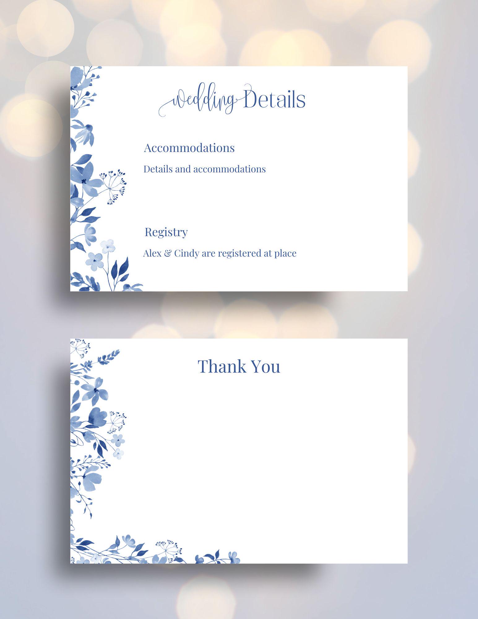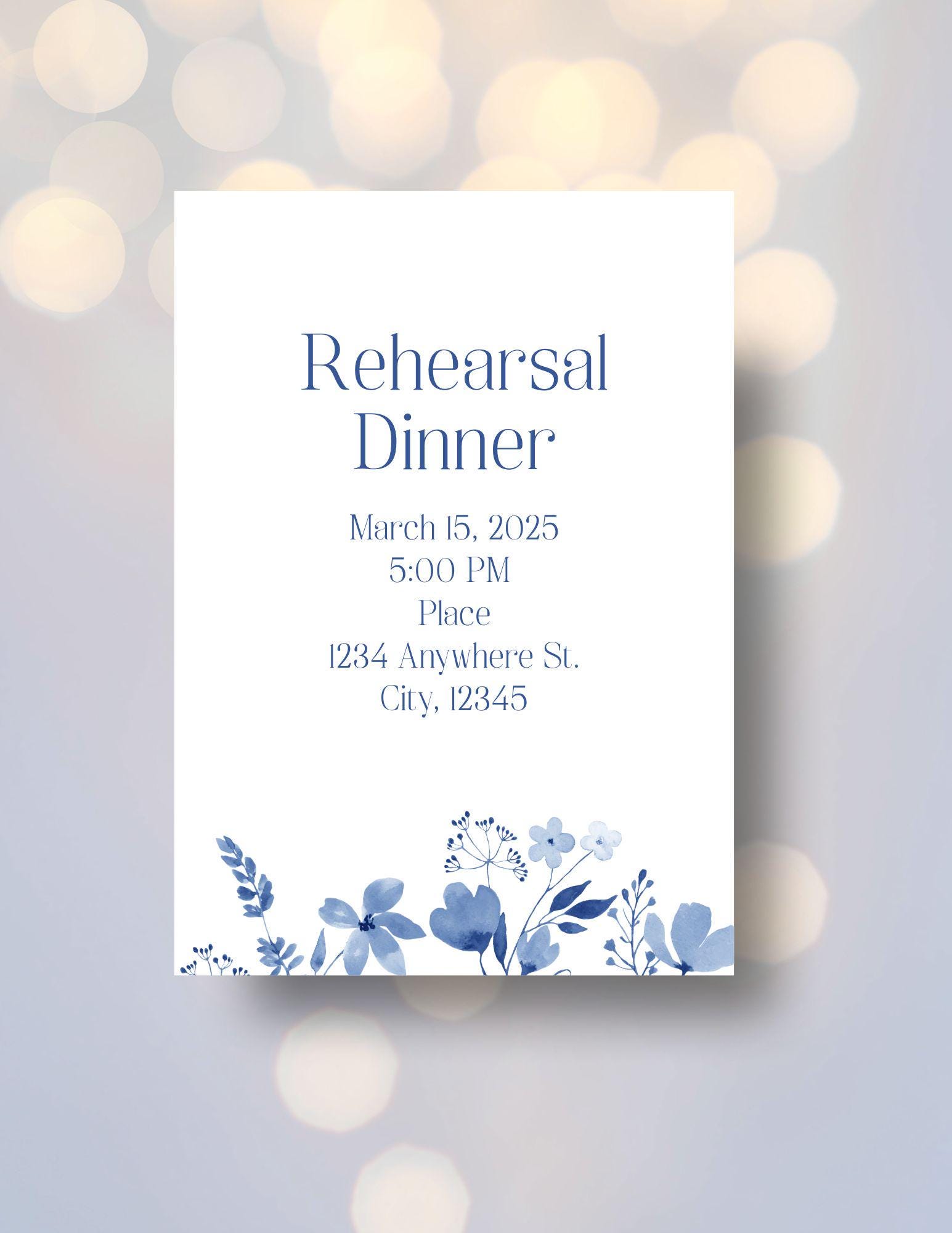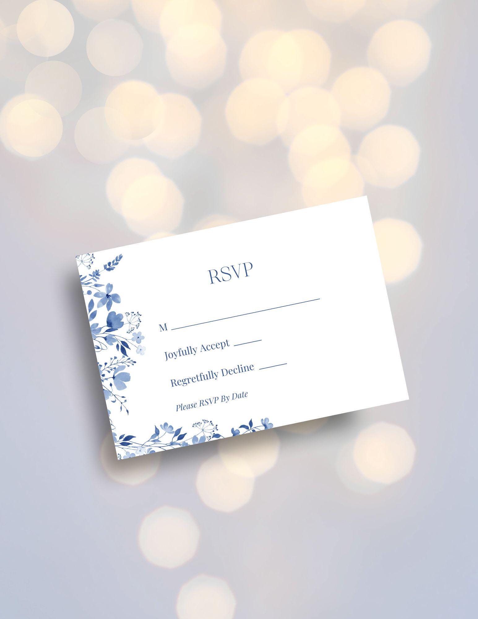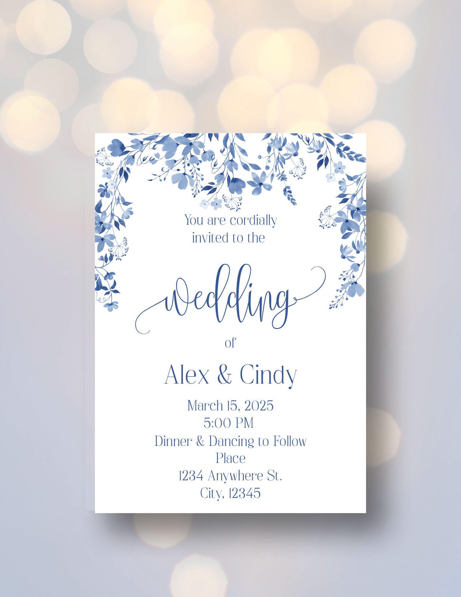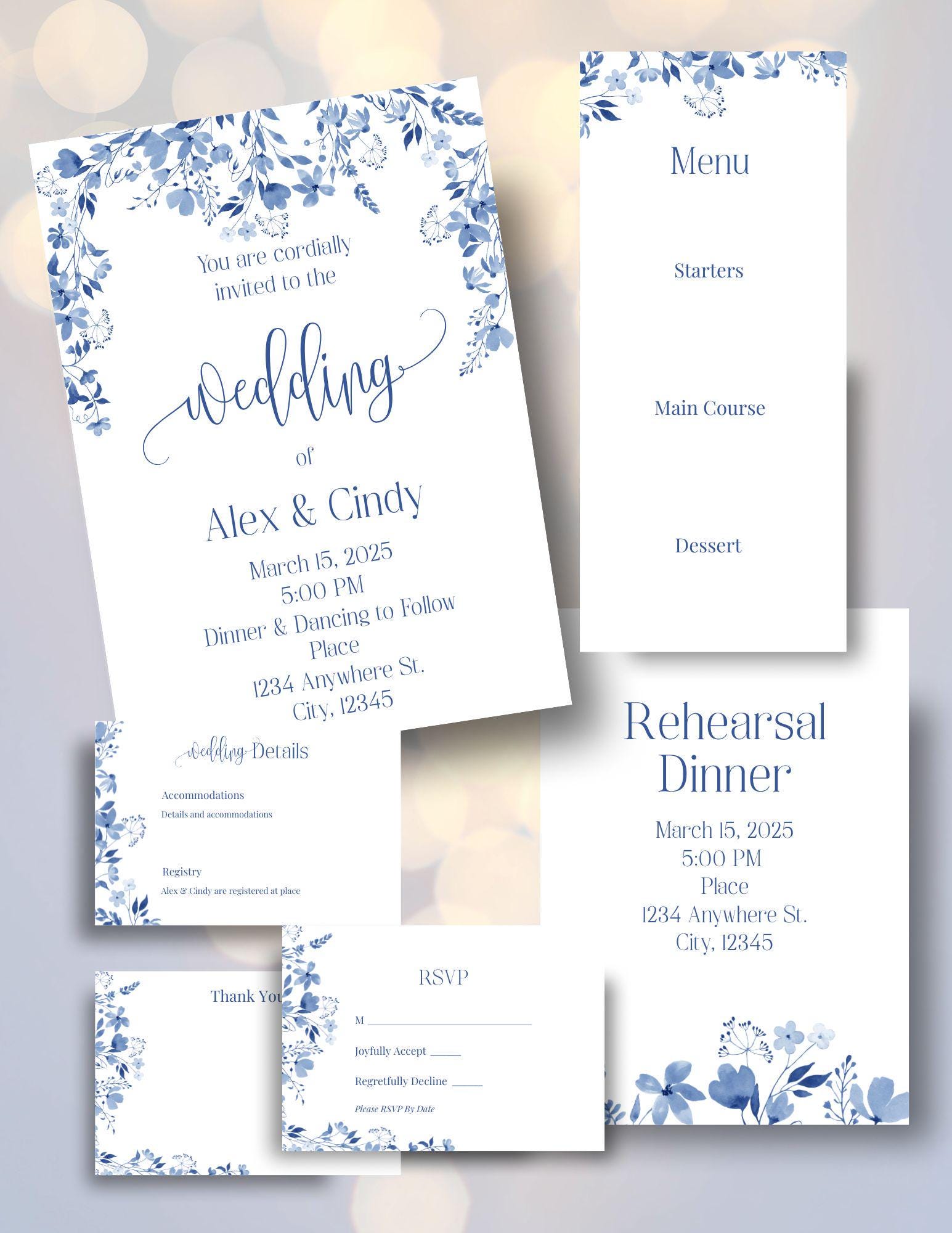 Say "I DO" with this simple but elegant invitation. Blue flower border brings a little color to this custom digital wedding set; invitation, rehearsal dinner invitation, menu, wedding details card, RSVP card, and thank you card. Wording and flowers can be placed on any color cardstock you want.