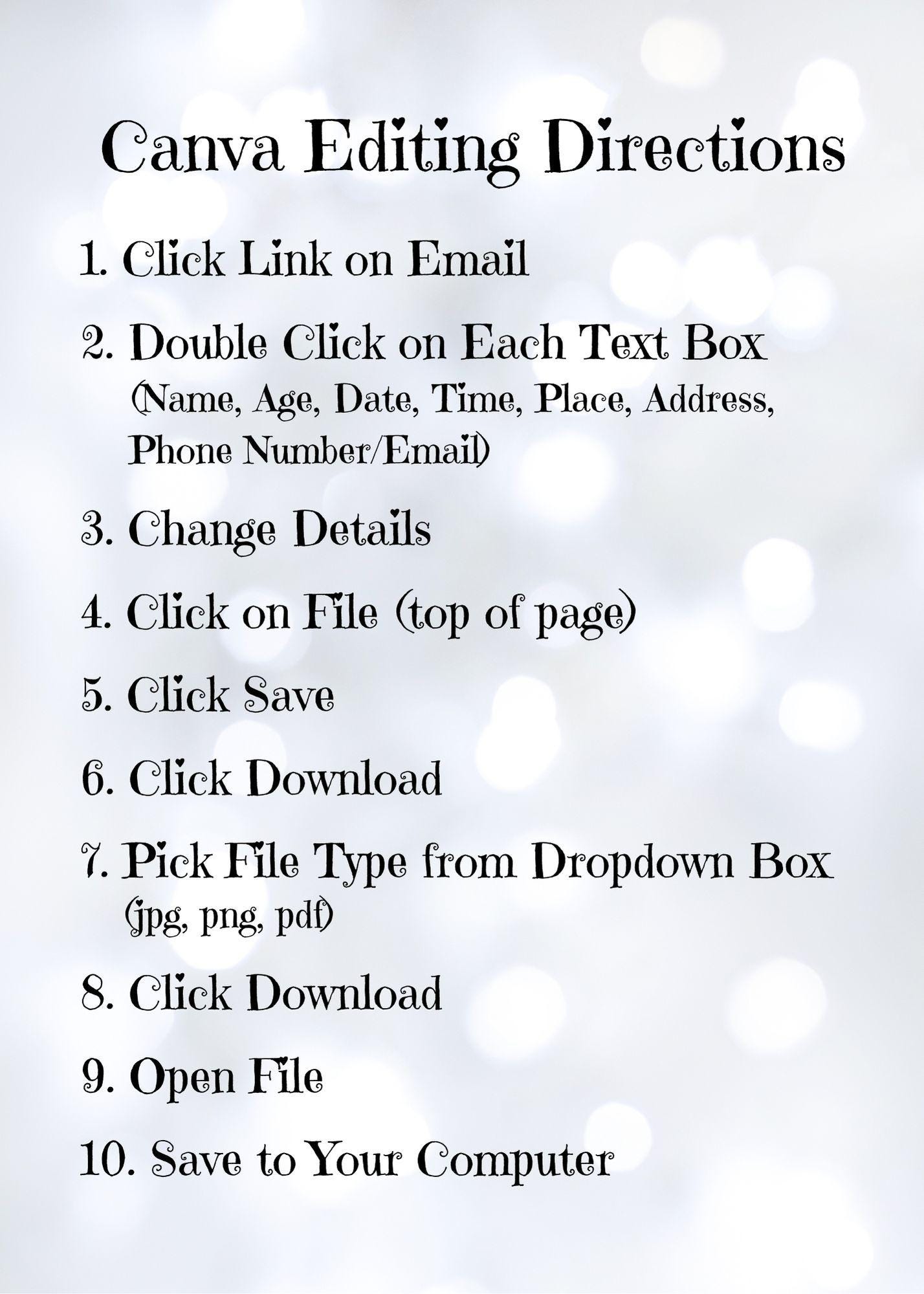 Name, Age, Date of Event, Time, Place, Address, RSVP (phone number, email, or both), Download Type (jpg, png, pdf) Notes if Any.