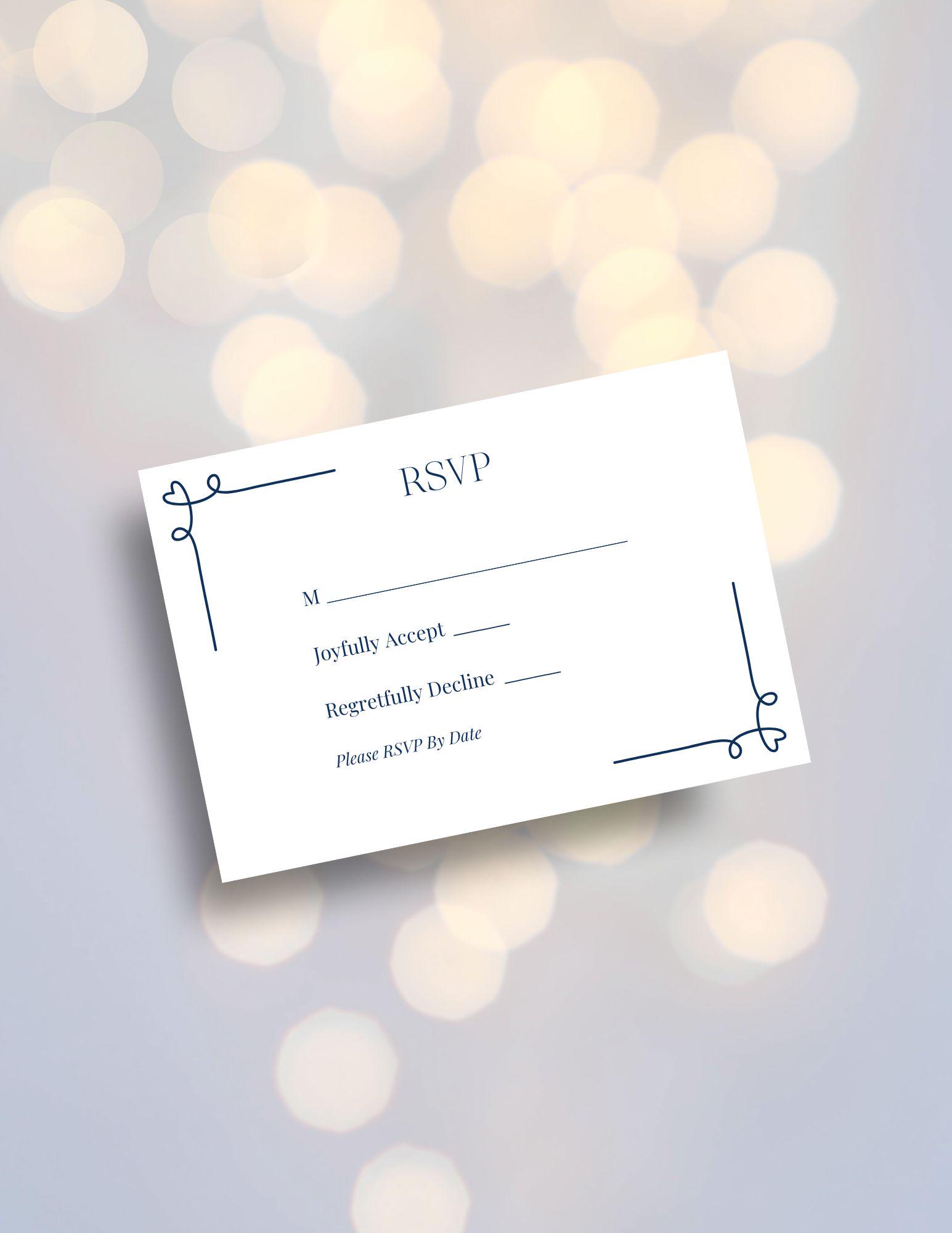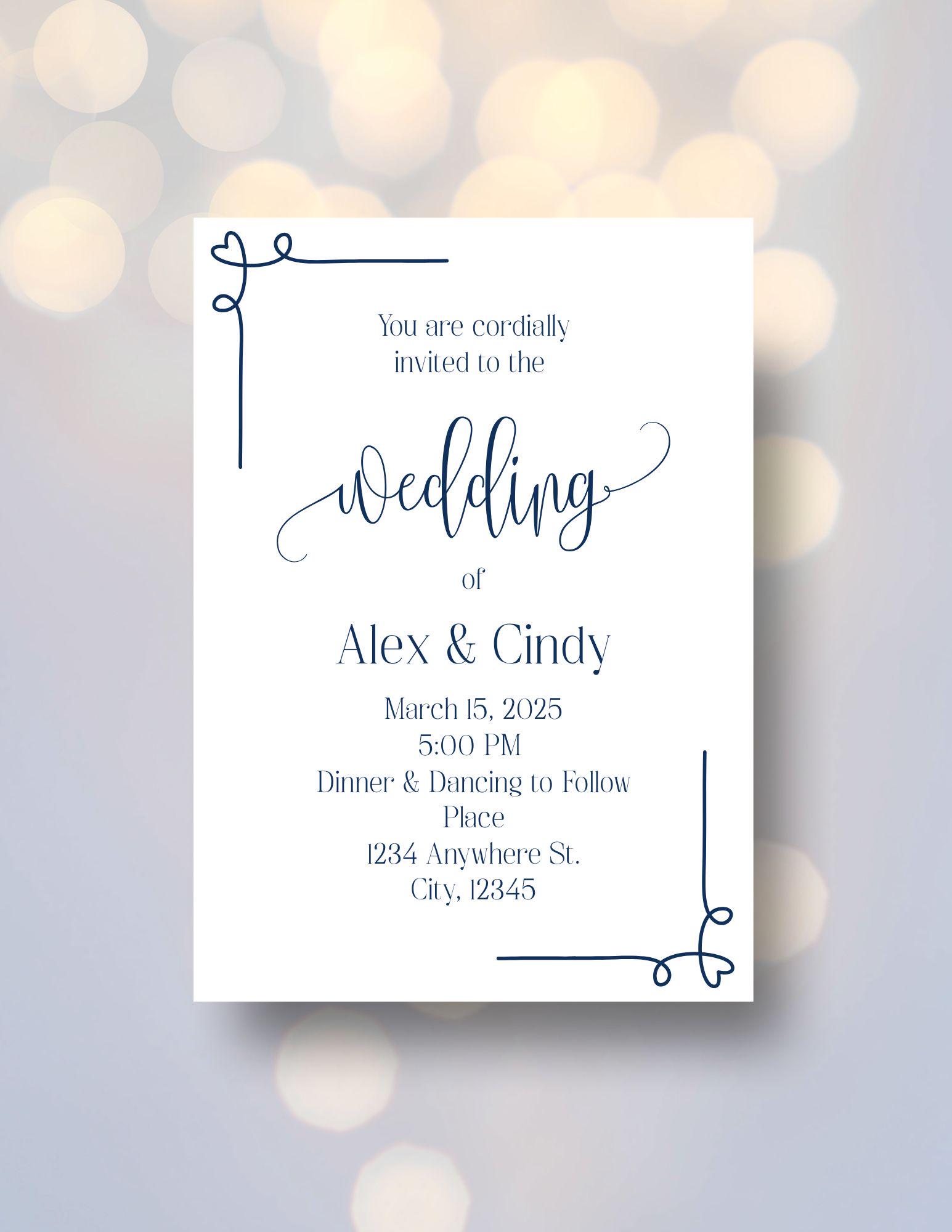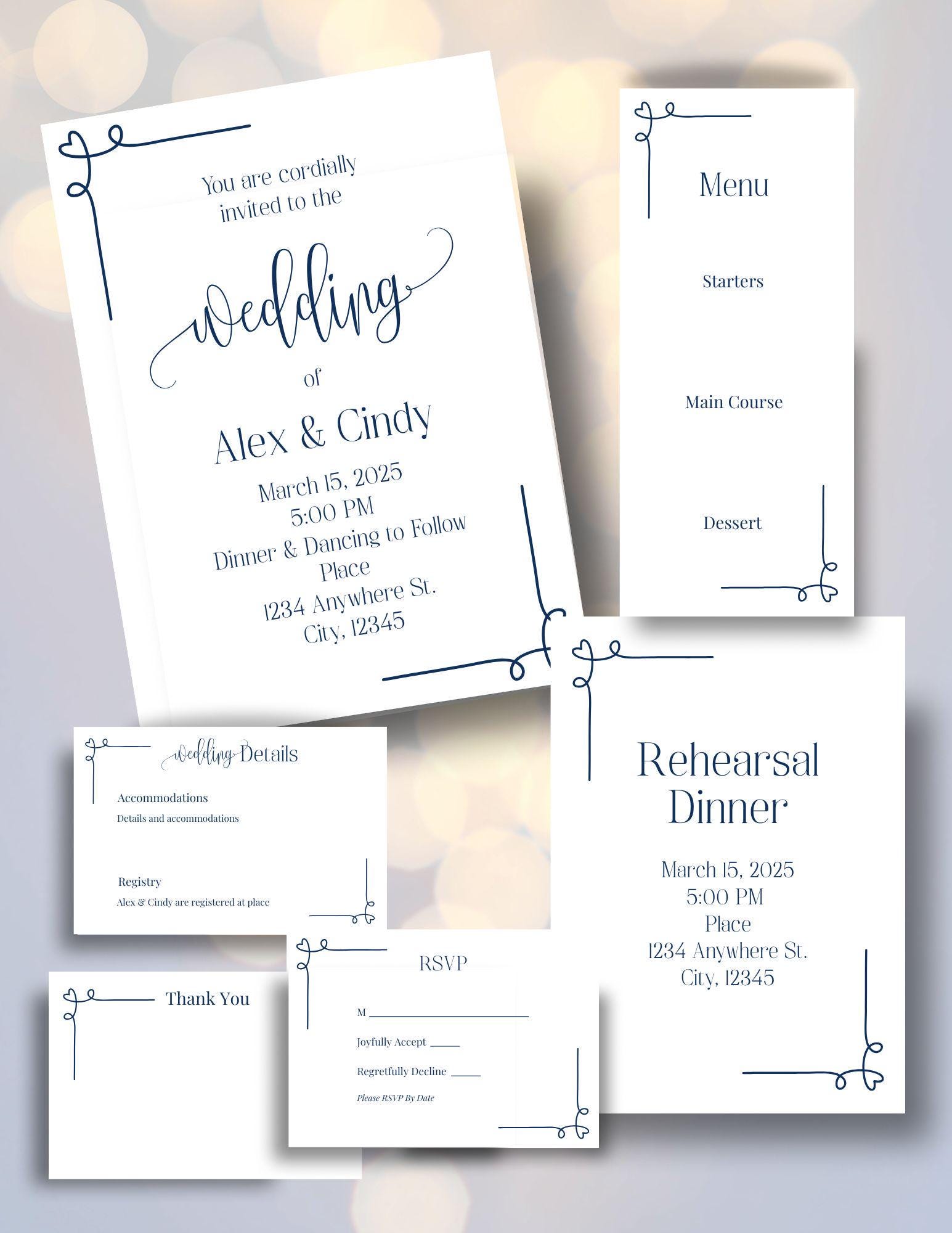 Love is in the air and a wedding is approaching. Invite guests to your wedding with this simple but elegant invitation. Navy blue heart swirls border this custom digital wedding set; invitation, rehearsal dinner invitation, menu, wedding details card, RSVP card, and thank you card. Wording and hearts can be placed on any color cardstock you want.