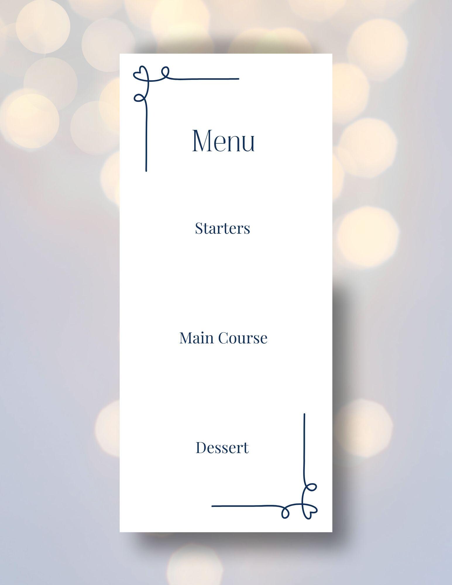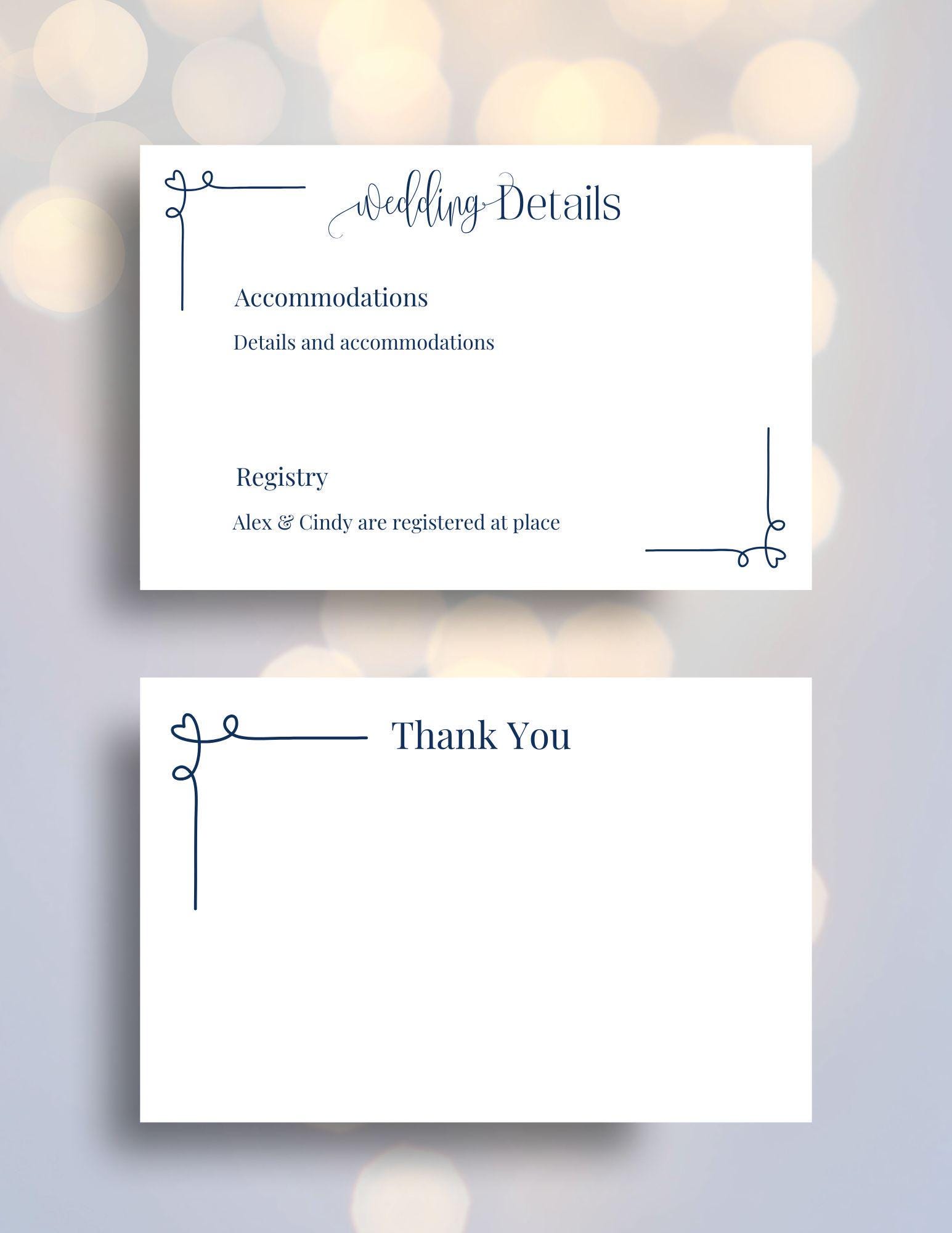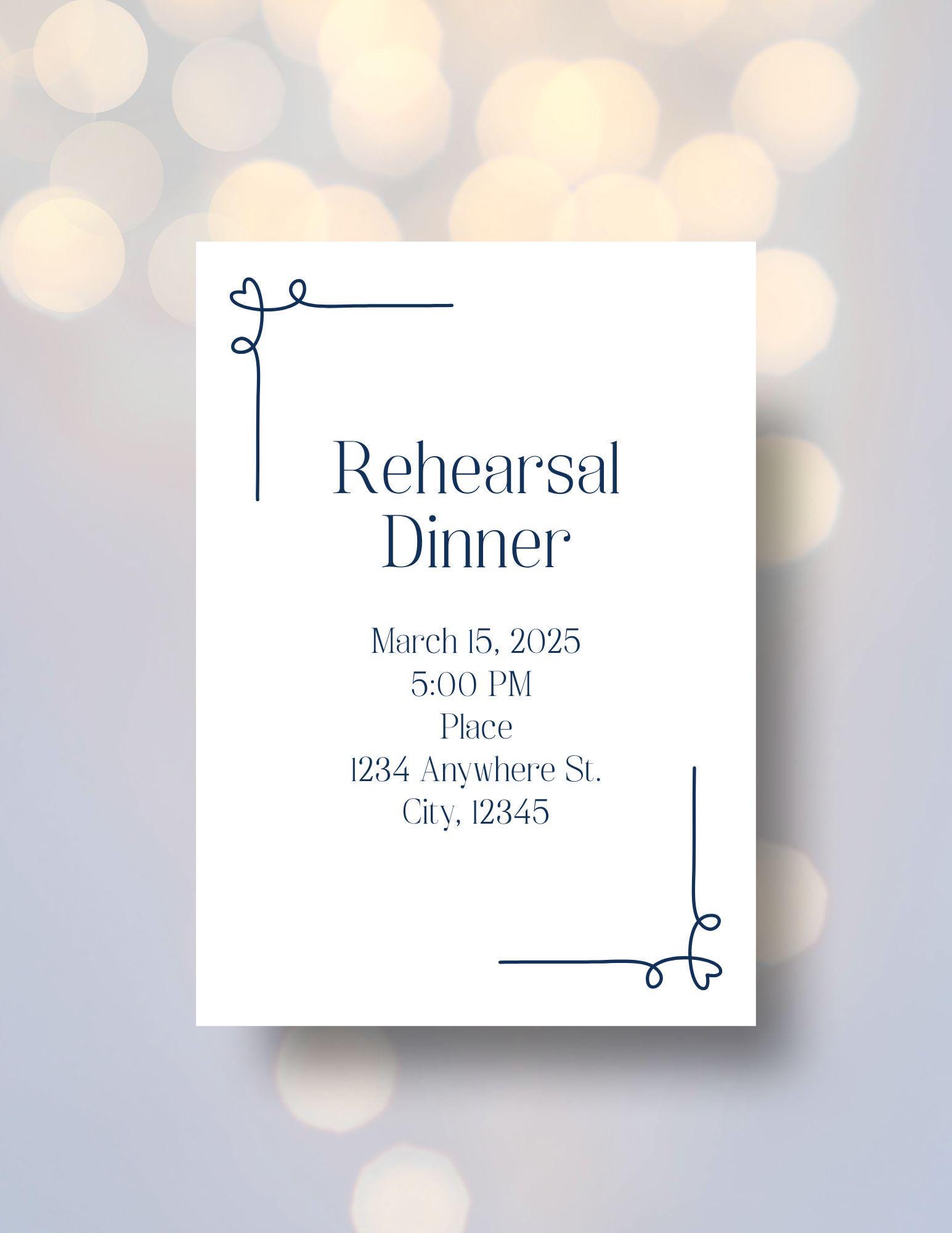 Love is in the air and a wedding is approaching. Invite guests to your wedding with this simple but elegant invitation. Navy blue heart swirls border this custom digital wedding set; invitation, rehearsal dinner invitation, menu, wedding details card, RSVP card, and thank you card. Wording and hearts can be placed on any color cardstock you want.