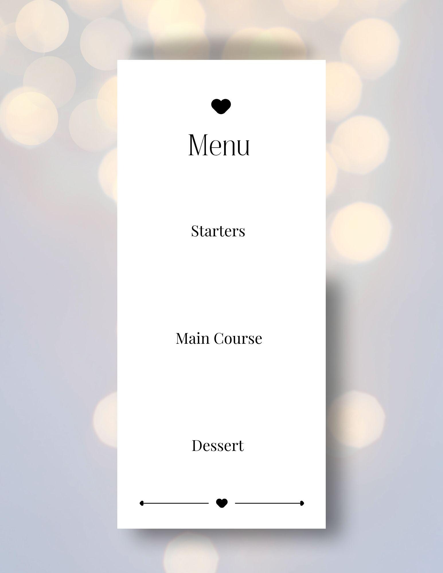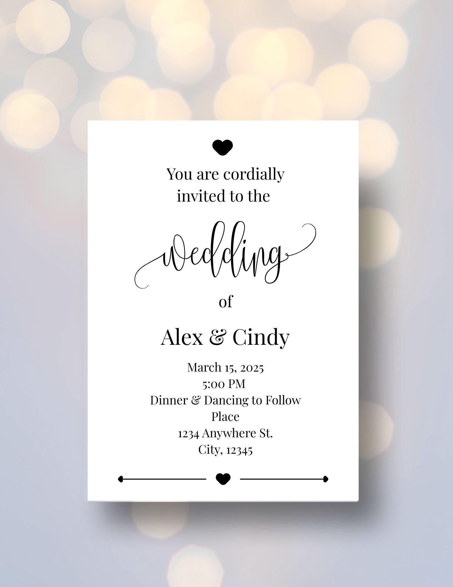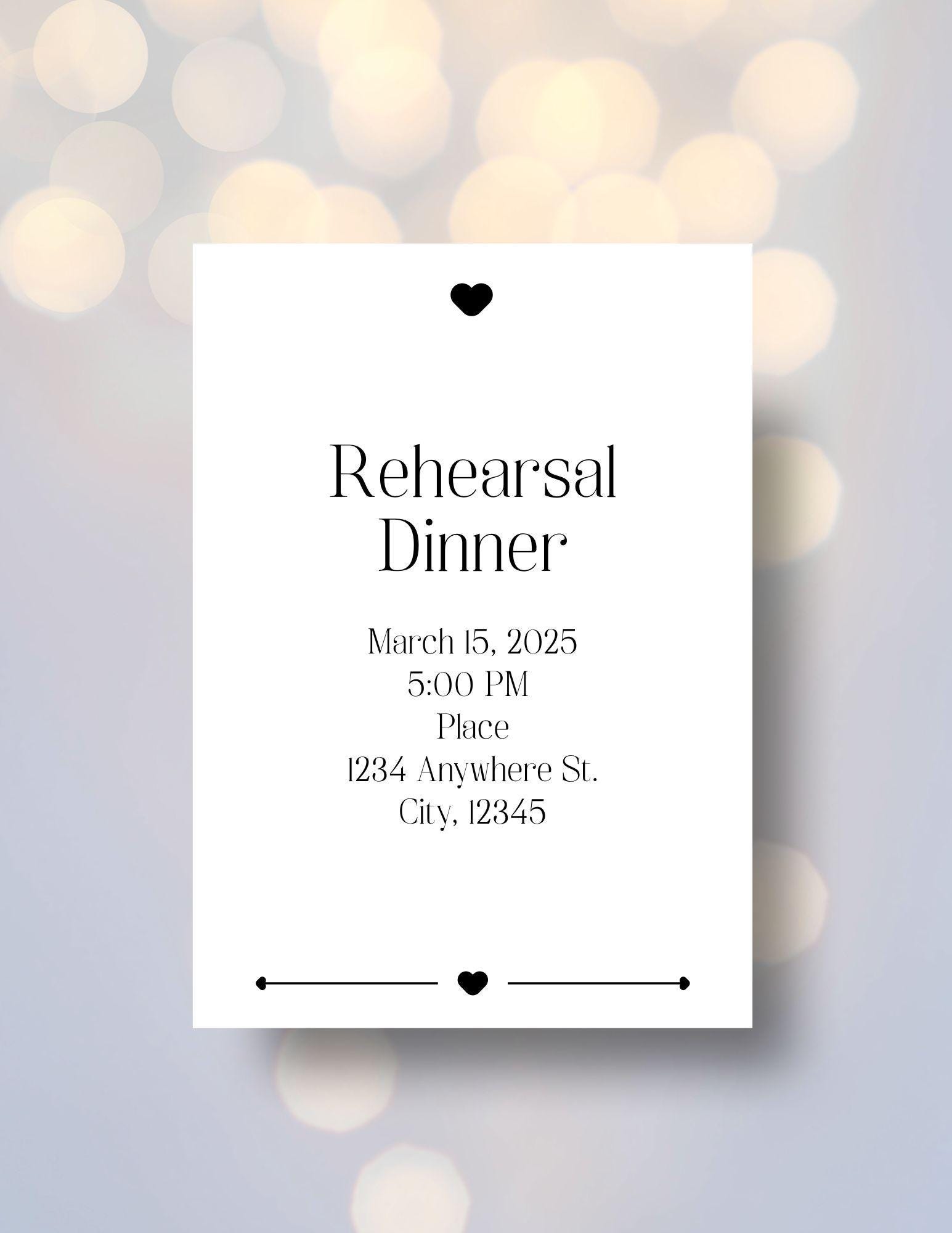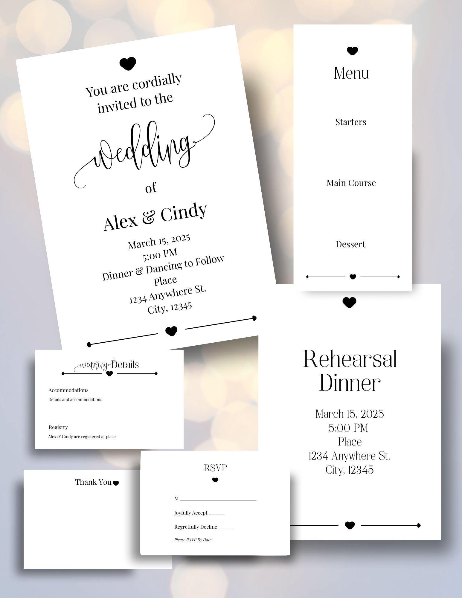 Nothing more says a couple is in love like hearts do. Invite guests to your wedding with this simple but elegant invitation. Black hearts border this custom digital wedding set; invitation, rehearsal dinner invitation, menu, wedding details card, RSVP card, and thank you card. Wording and hearts can be placed on any color cardstock you want.