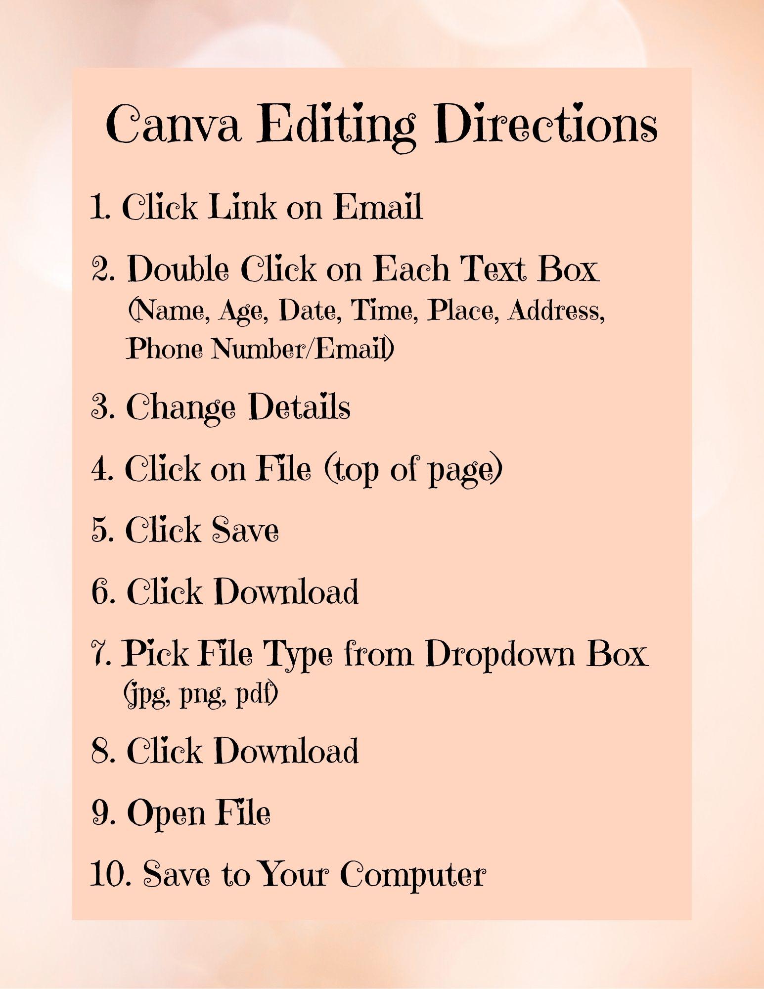 Name, Age, Date of Event, Time, Place, Address, RSVP (phone number, email, or both), Download Type (jpg, png, pdf) Notes if Any.