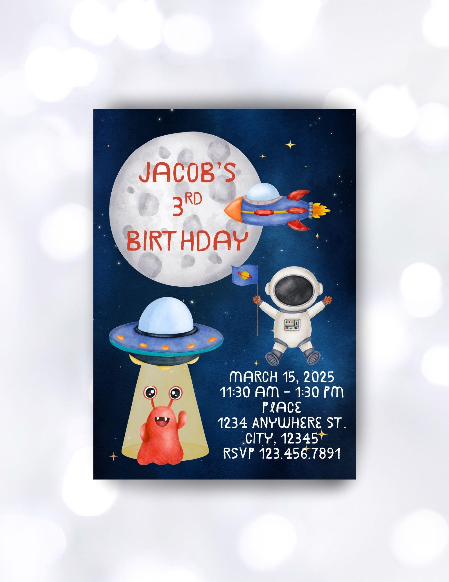 One, Two, Three Blast Off! Every little boy dreams of going to space. Invite friends with this out of this world invitation. Edit this custom digital invitation with your own details.