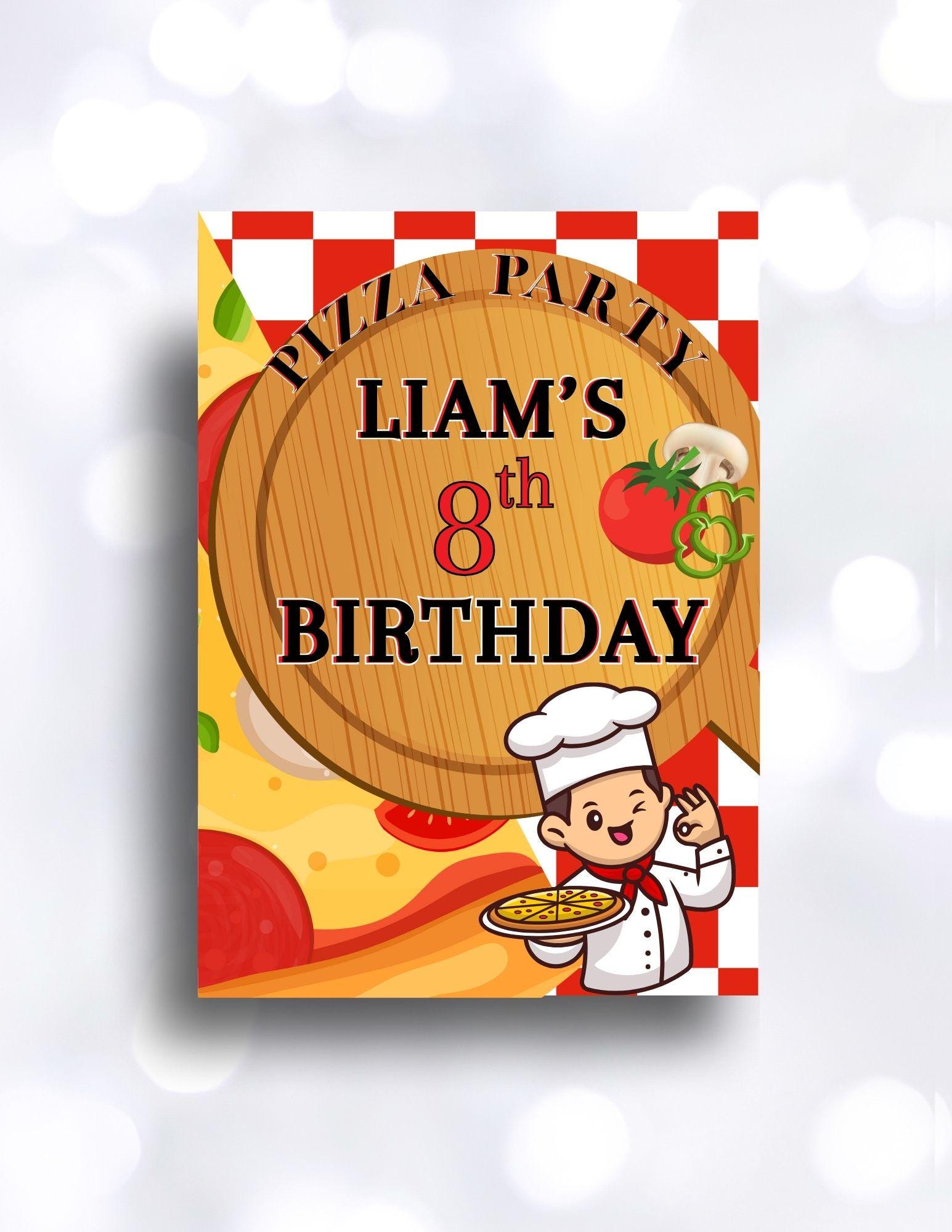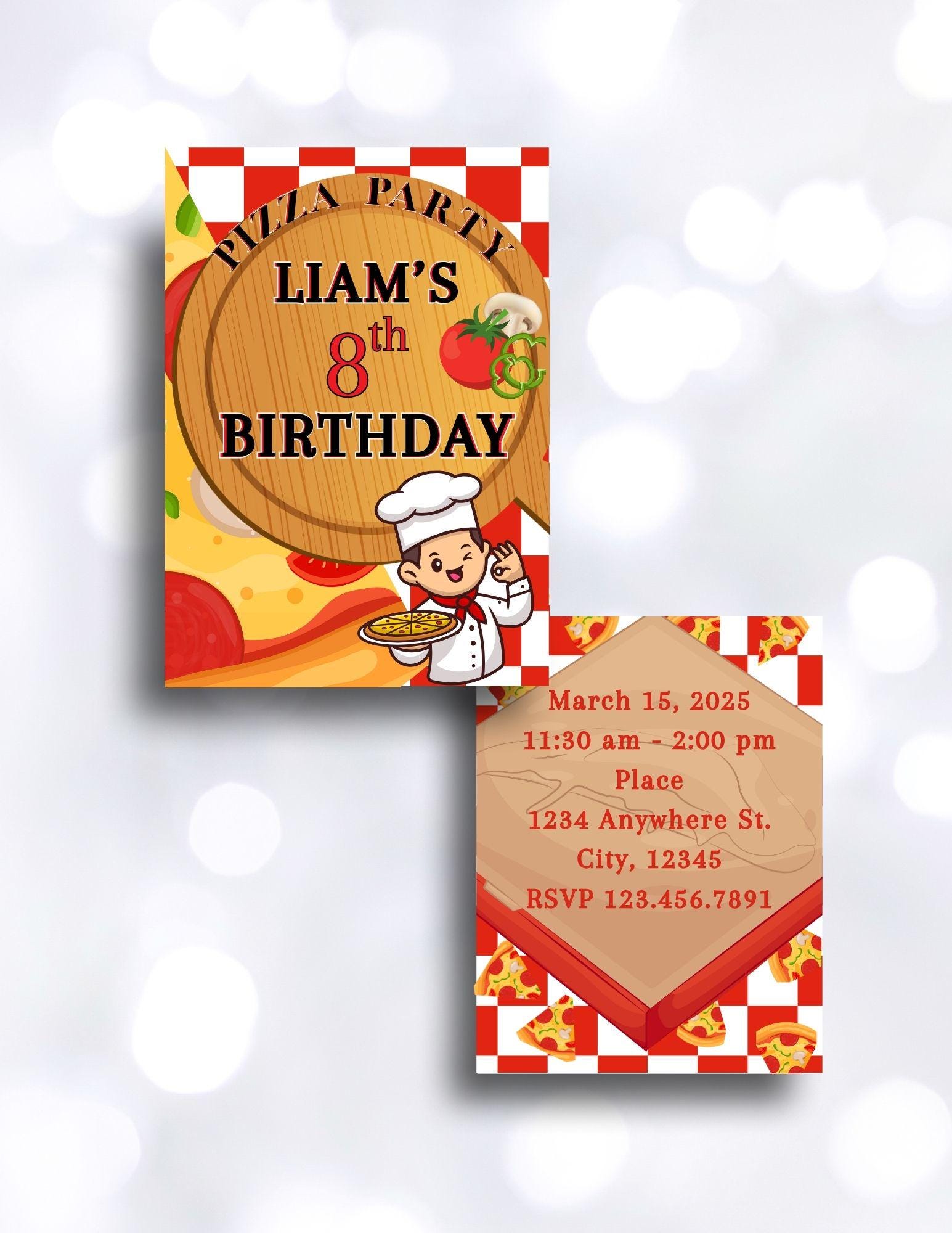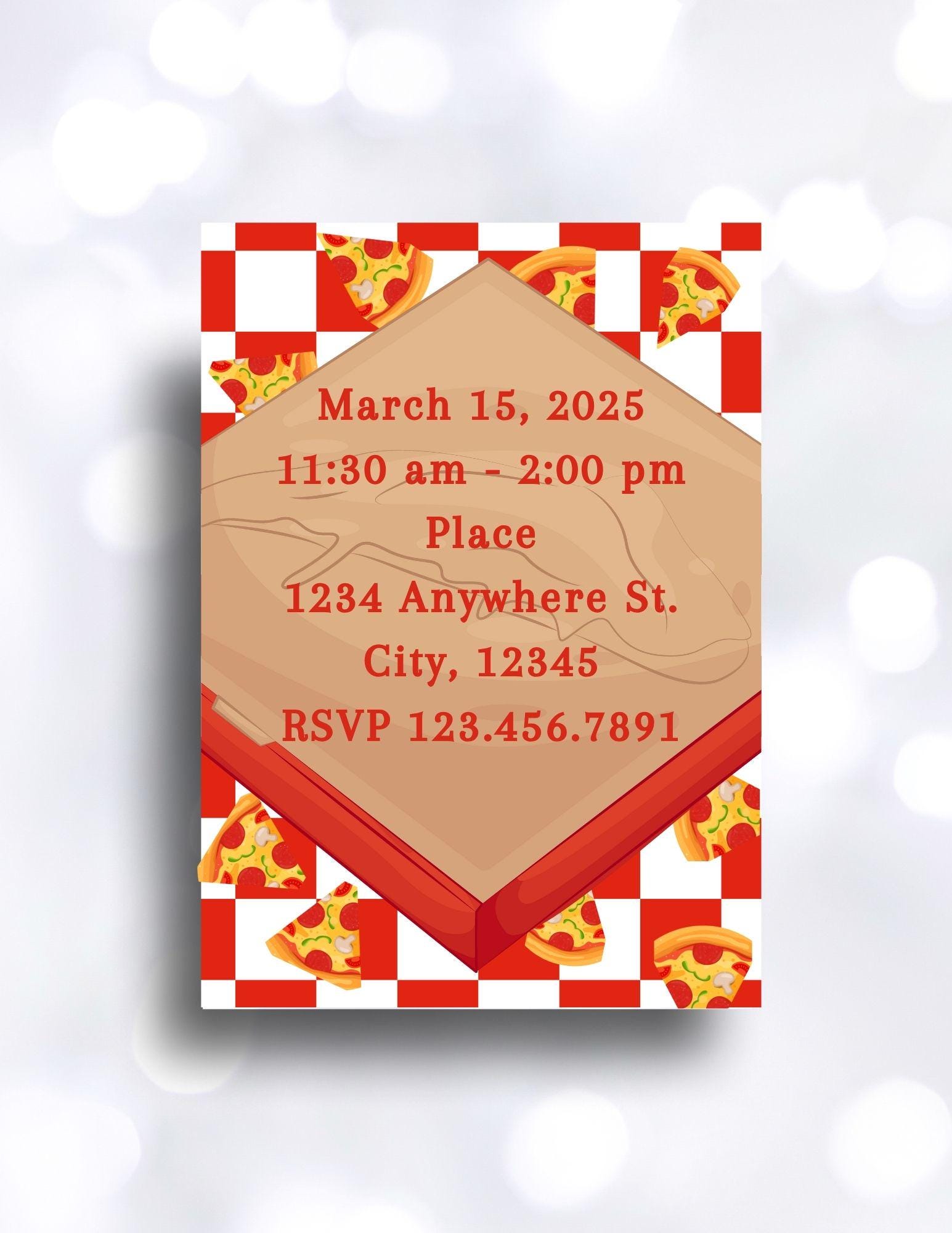It's a pizza party! Cheese, pepperoni, mushrooms, peppers, sausage...yummy! Edit this custom 5x7 two-sided invitation with your own details.
