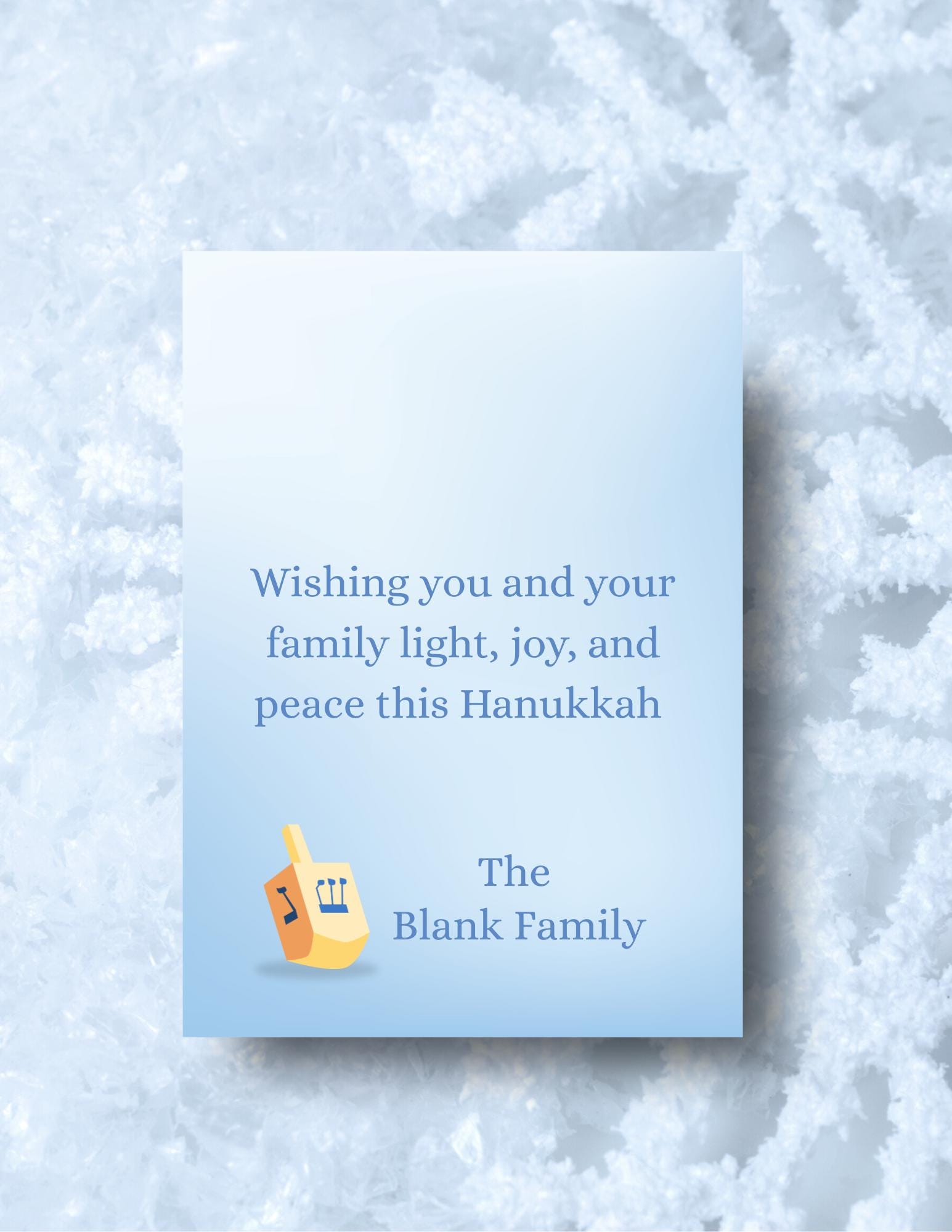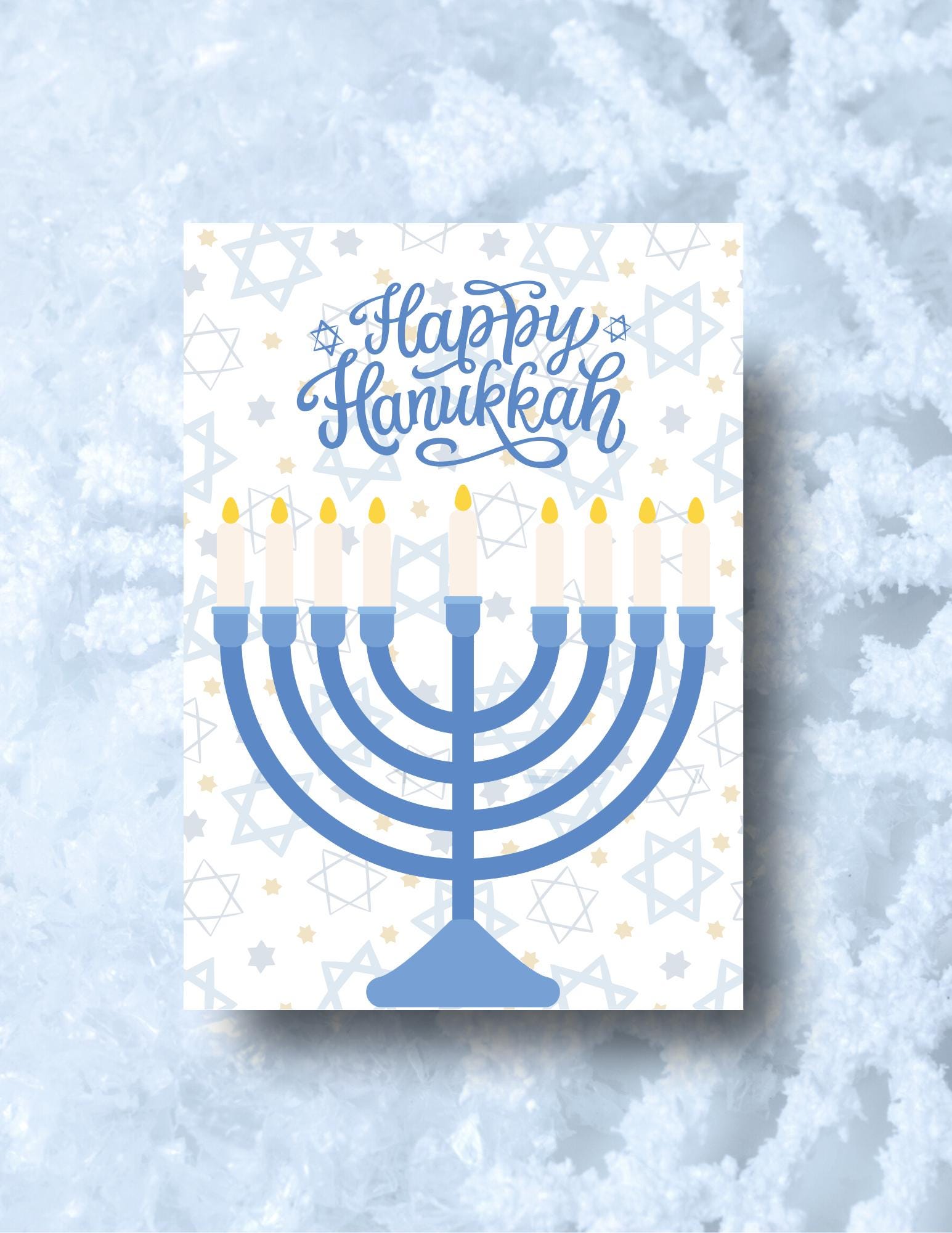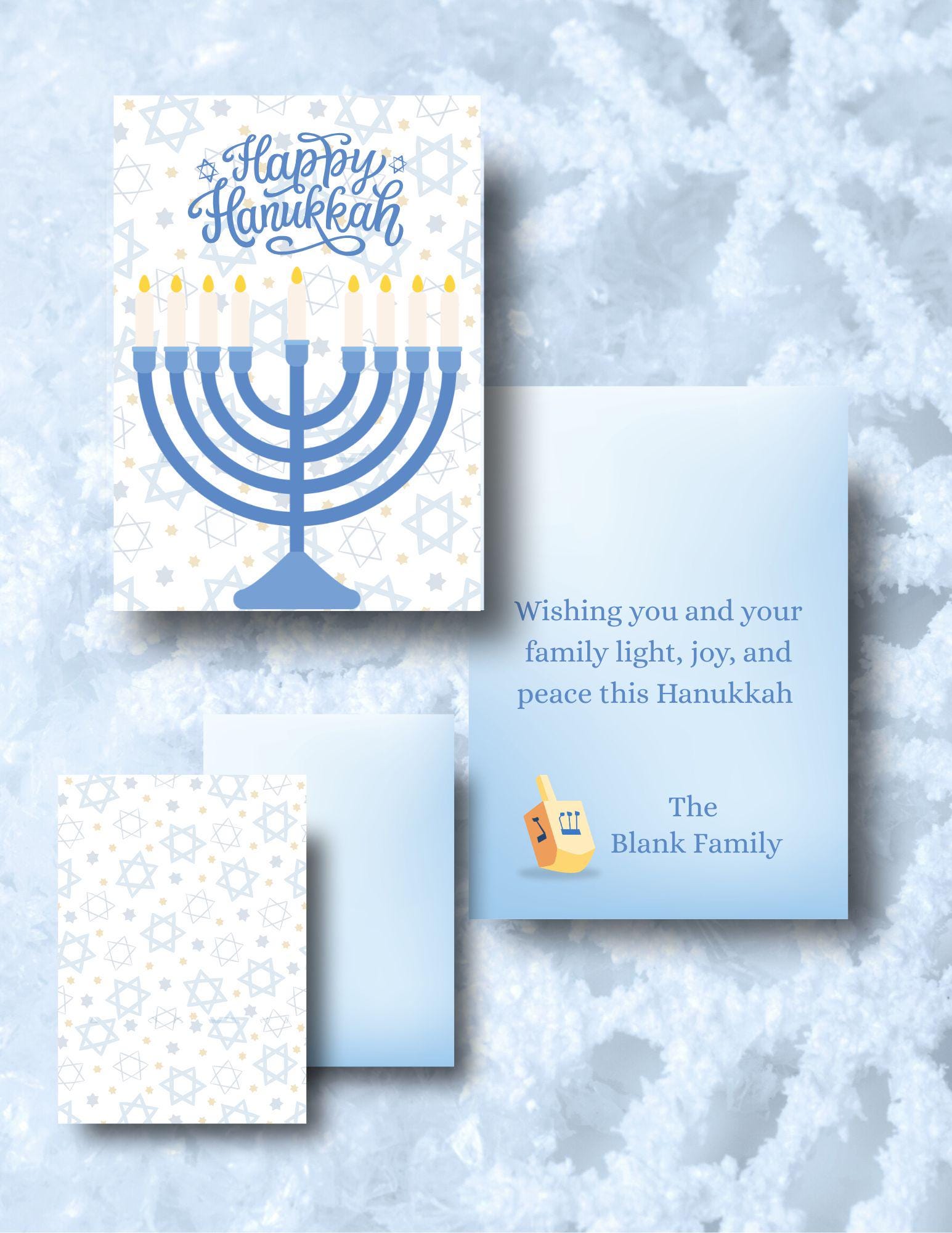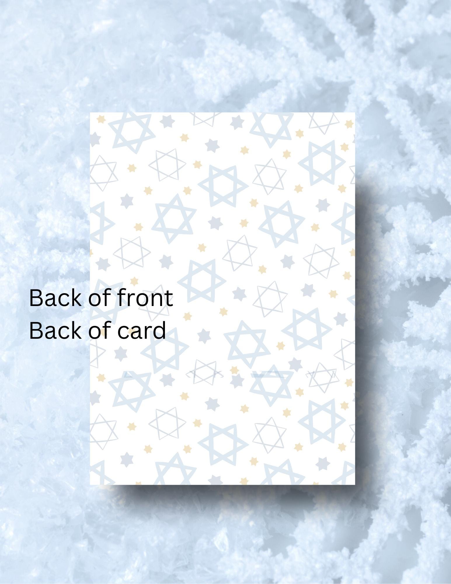 This Hannukah send friends and family this Hannukah greeting card. This card will get everyone in the spirit, featuring a Menorah with Star of David's surrounding the background with a little dreidel inside. Choose which backing you want. Edit this custom 5x7 card with your own signature.