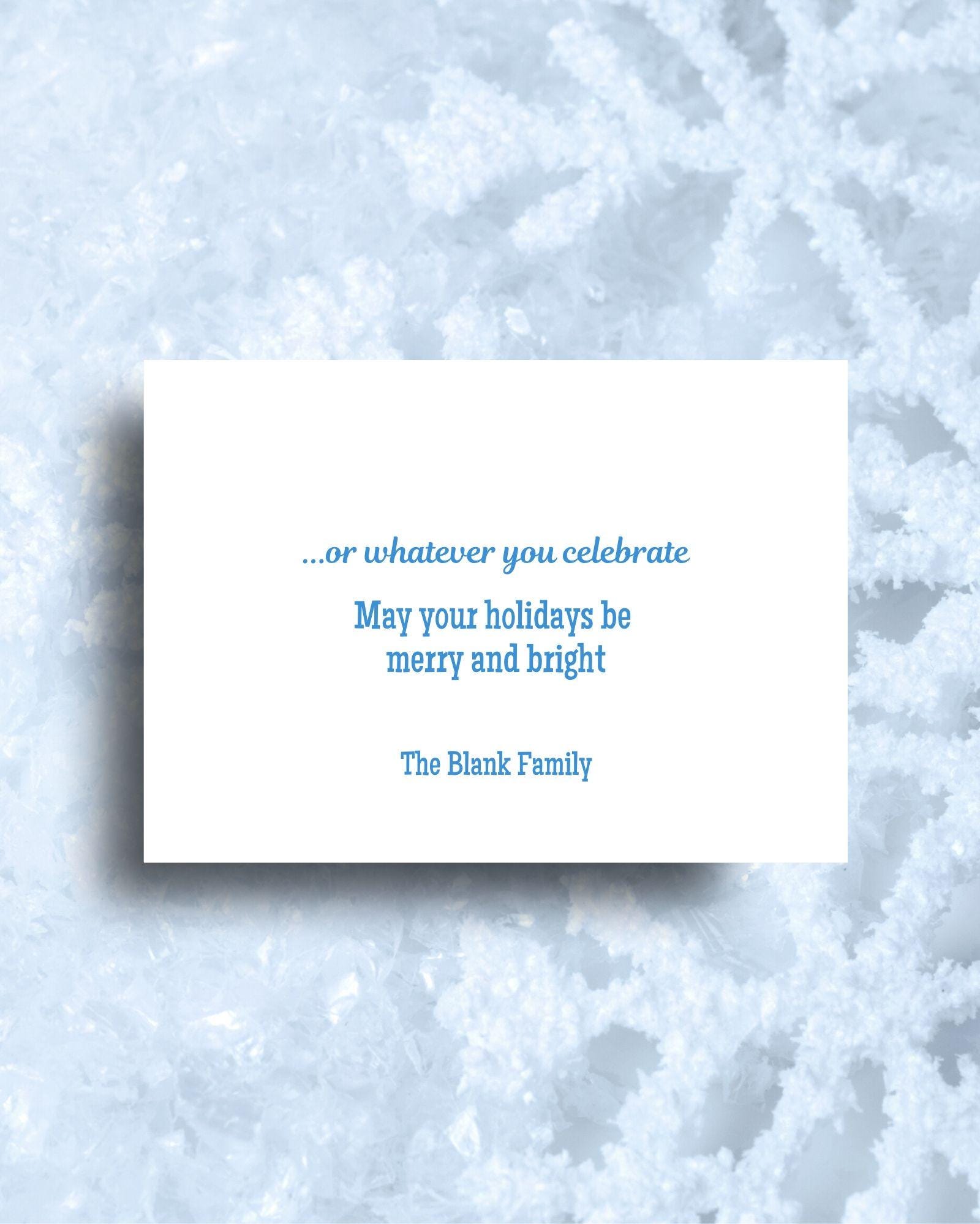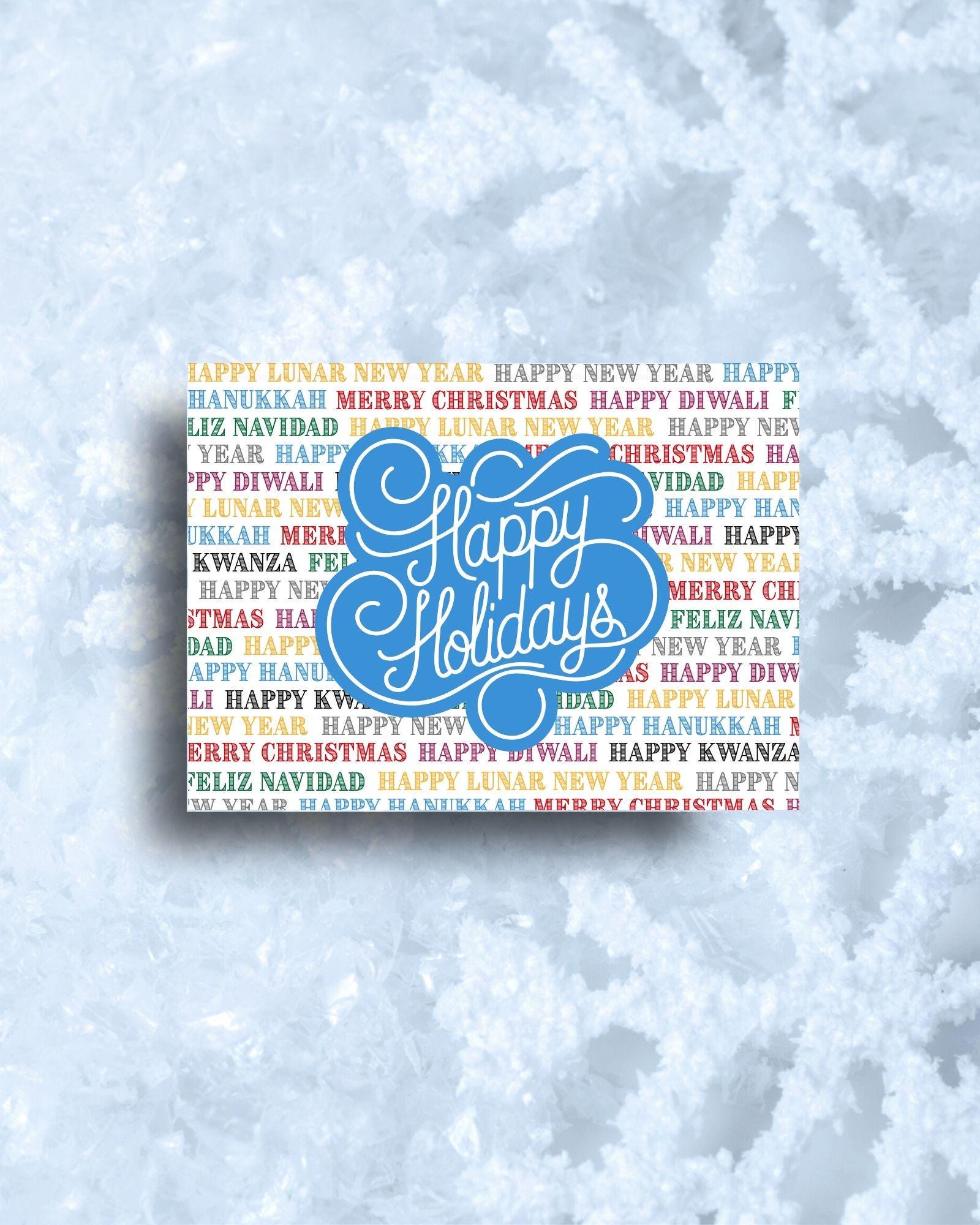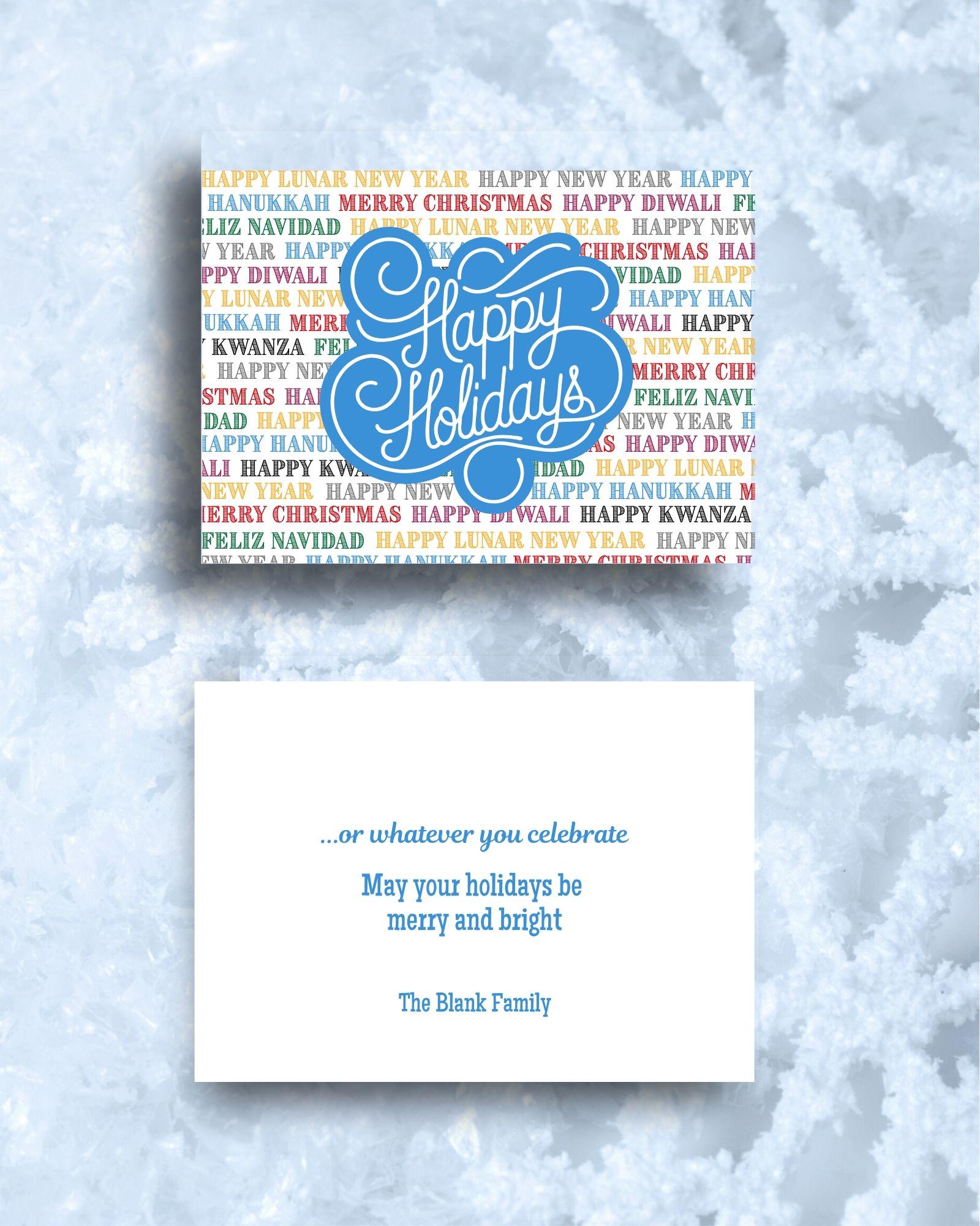 Merry Christmas, Happy Hanukkah, Happy Kwanza, Feliz Navidad, Happy Diwali, Happy Lunar New Year, and Happy New Year fills the front of this card. Happy Holidays...or whatever you celebrate. Edit this custom 5x7 holiday greeting card with your own signature.