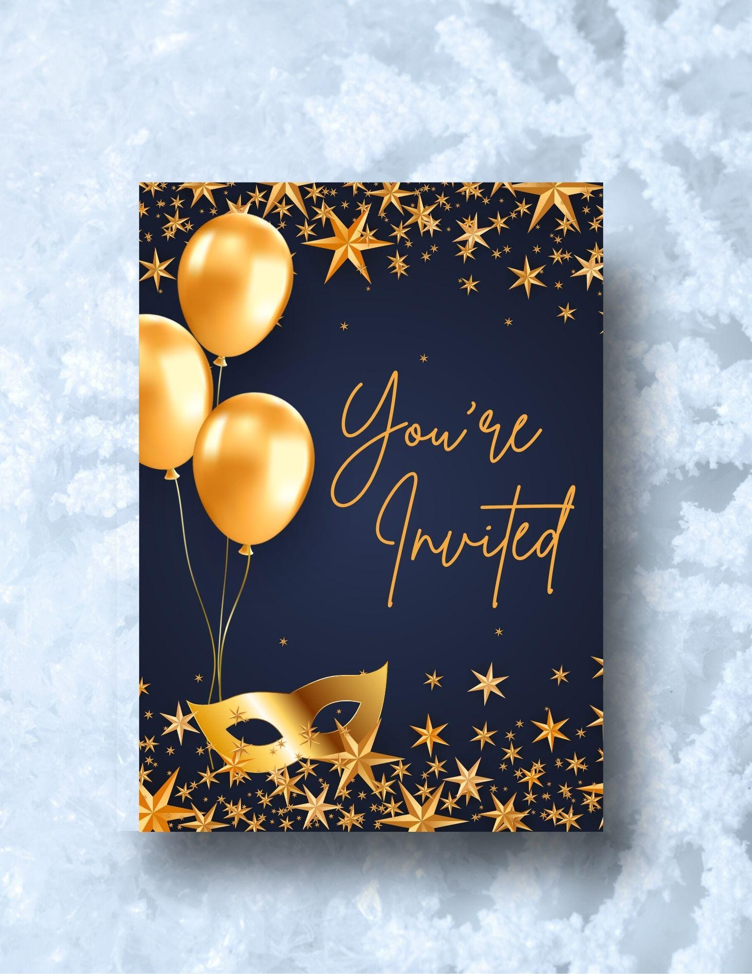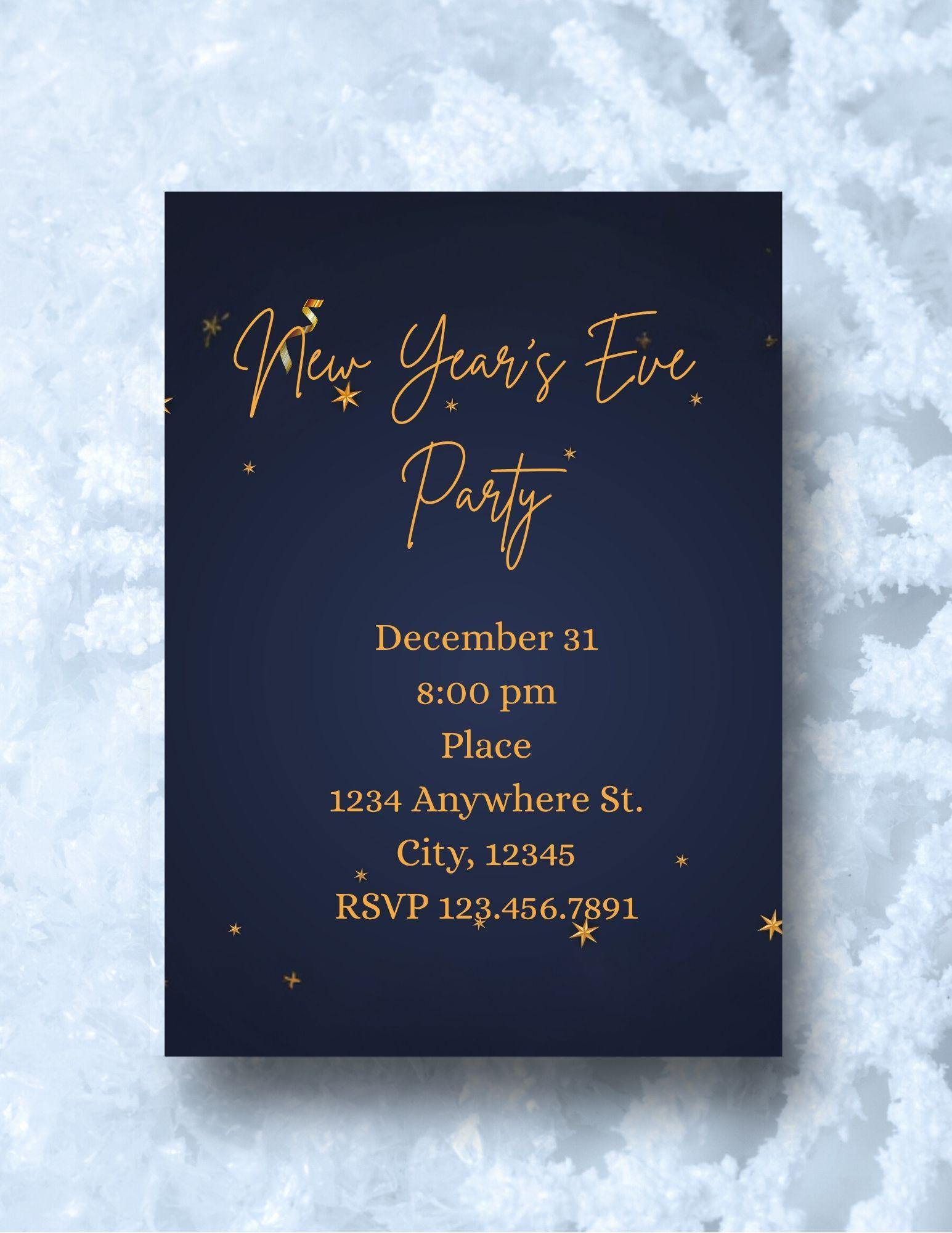 Bring in the New Year with navy blue and gold. Maybe a New Year's Masquerade Party, maybe a simple yet fun New Year's Party. Either way your friends and family won't want to miss your party when they receive this custom 5x7 party invitation. Edit with your own details.