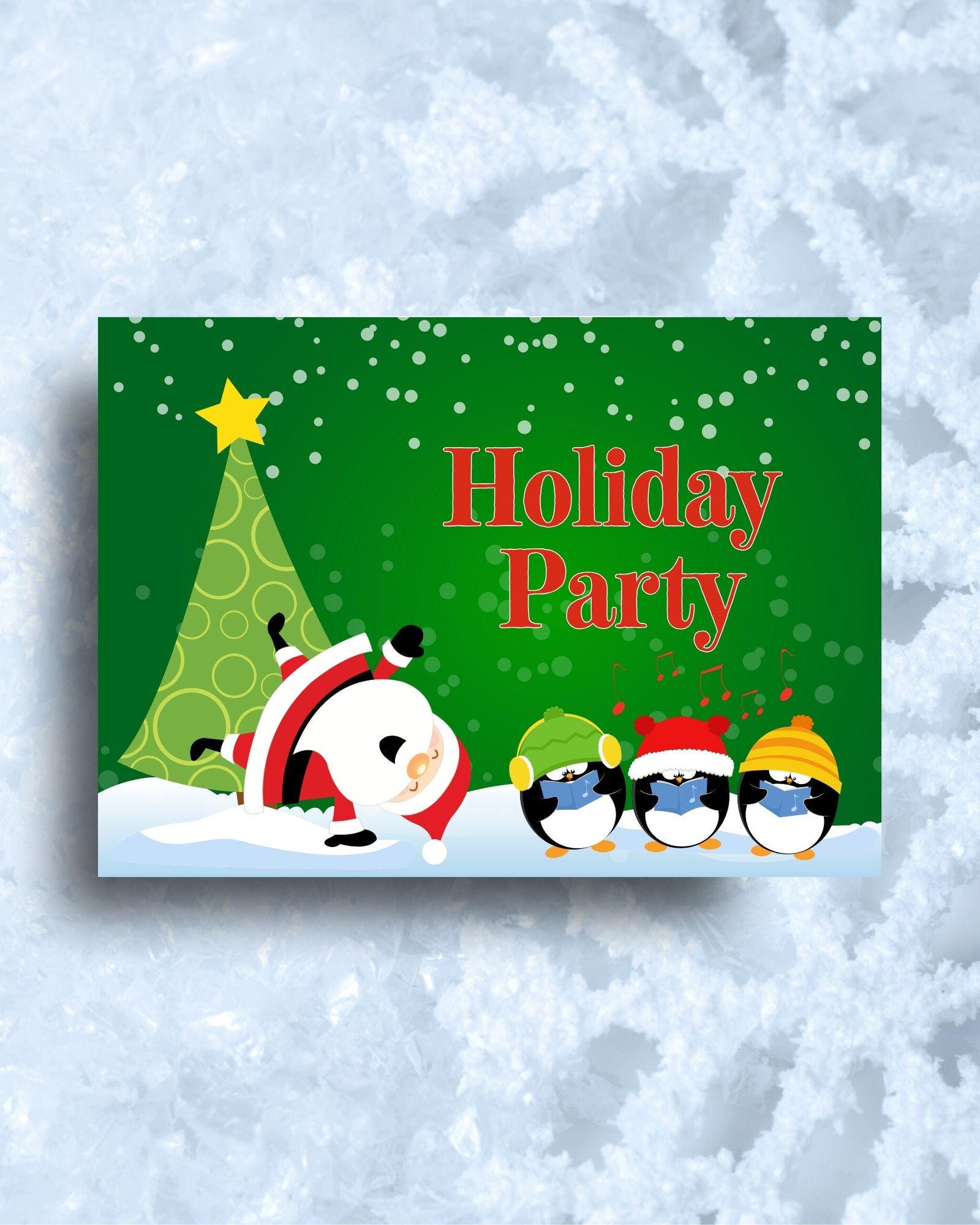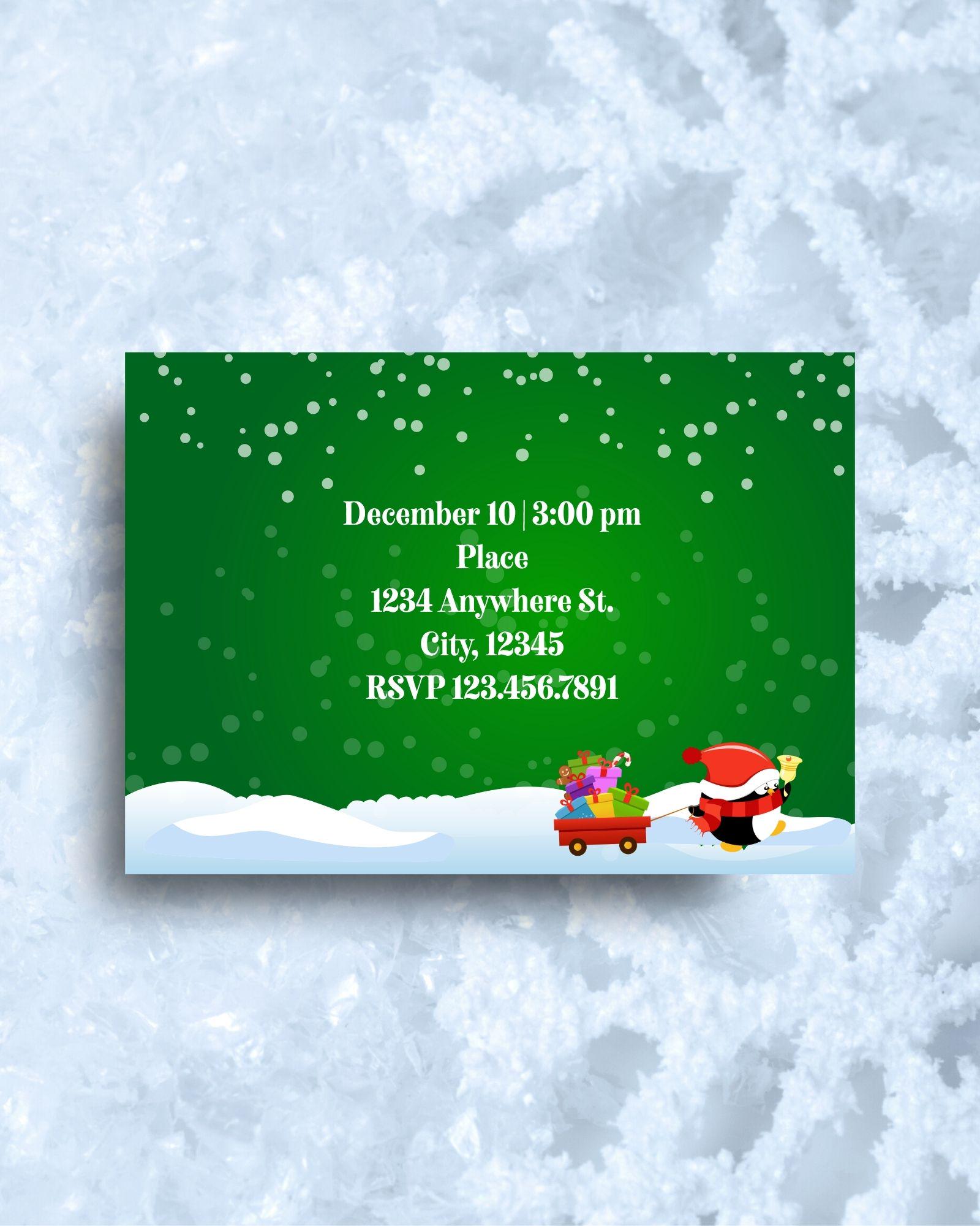Santa with his favorite crew...singing penguins. What is more fun than singing penguins, Santa doing a flip and snow. Invite friends and family with this fun, cute 5x7 custom invitation to your holiday party. Edit with your own details.