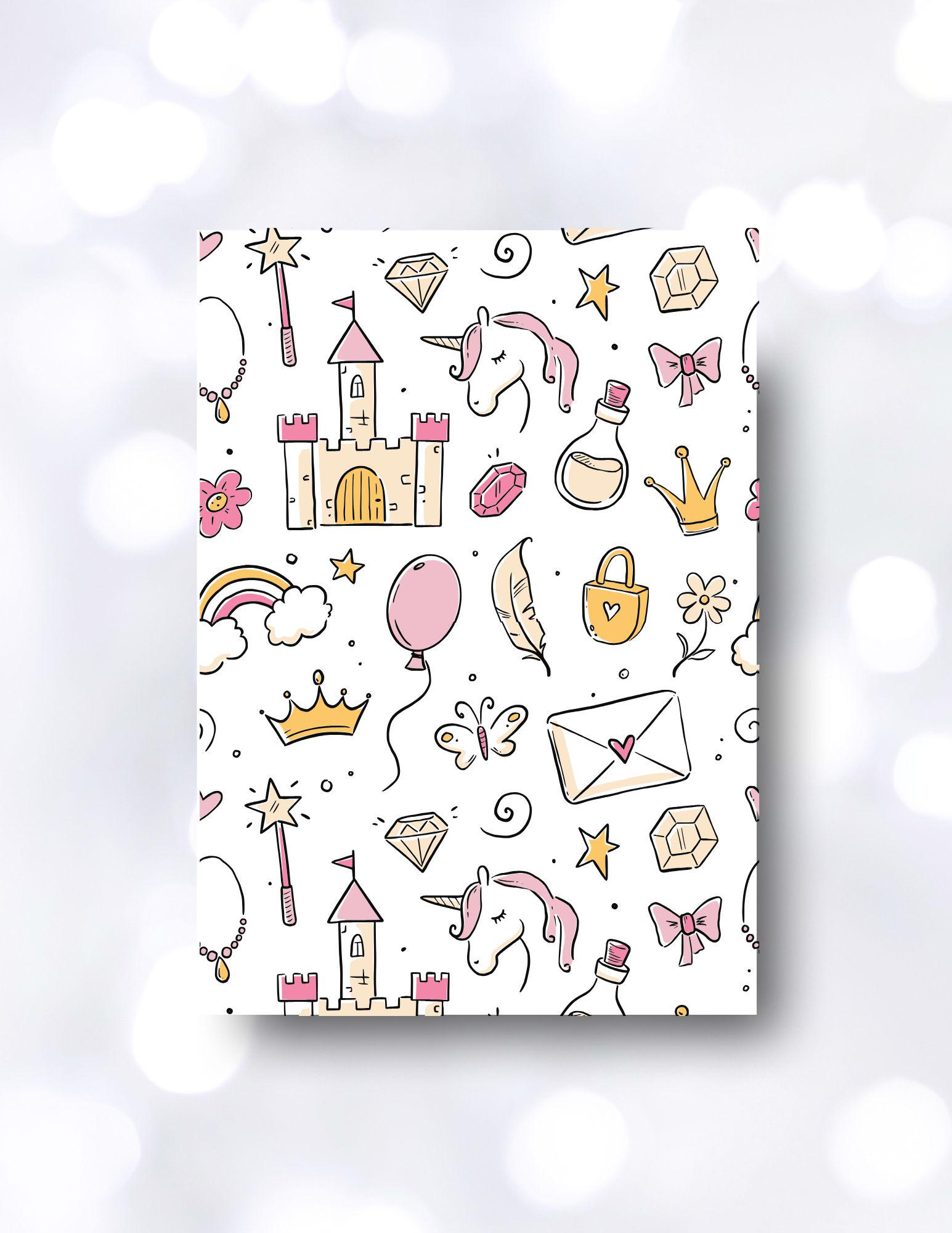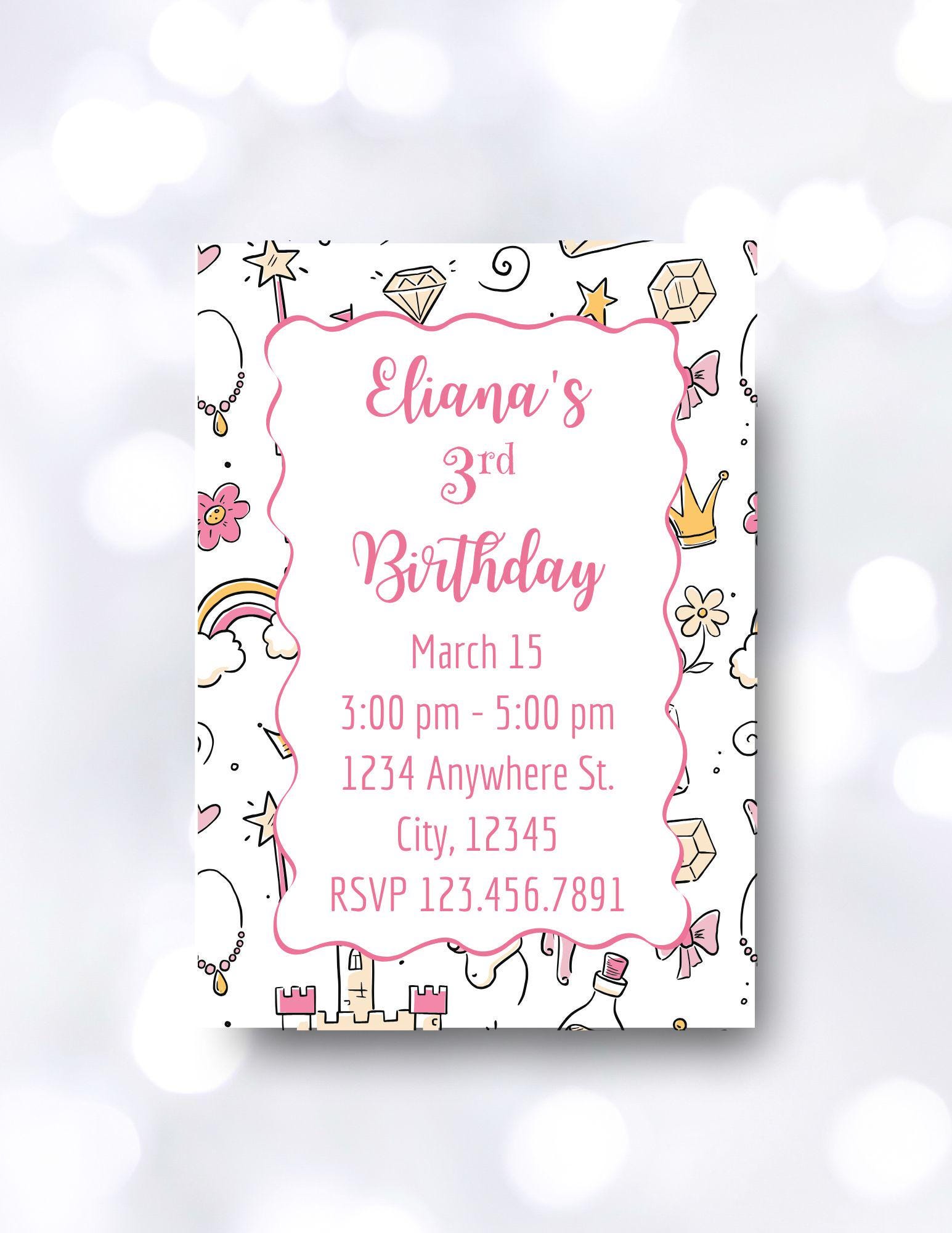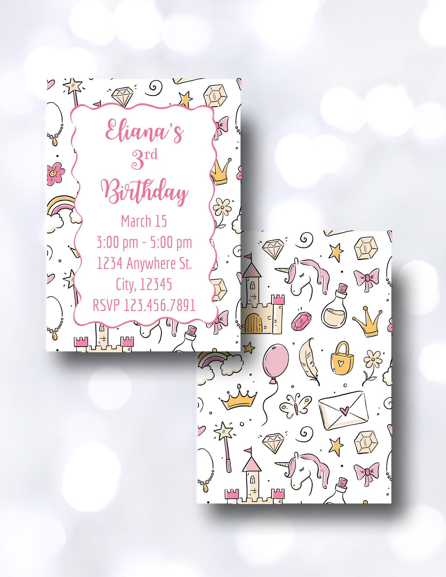This invitation has what every little princess wants for their birthday. Unicorns, crowns, magic wands, castles, butterflies, diamonds! Invite guest with this 5x7 digital custom invitation. Edit with your own details.