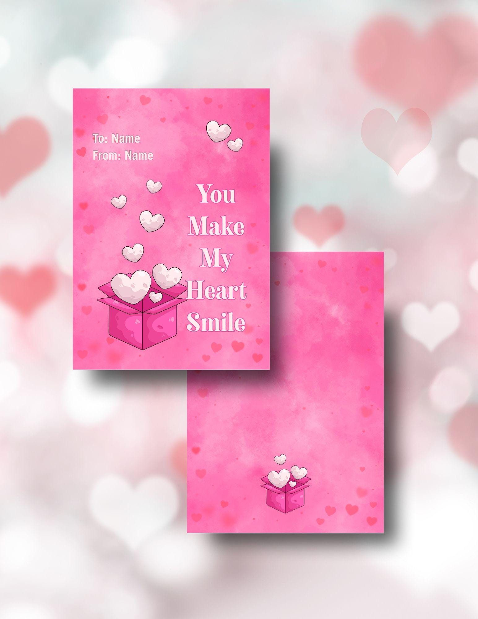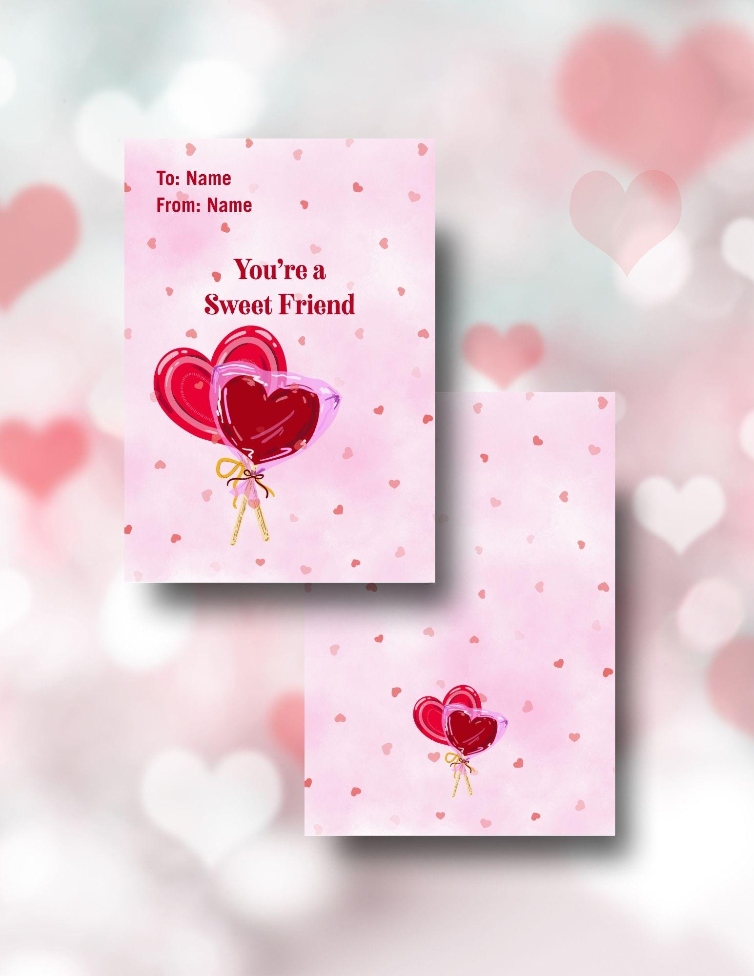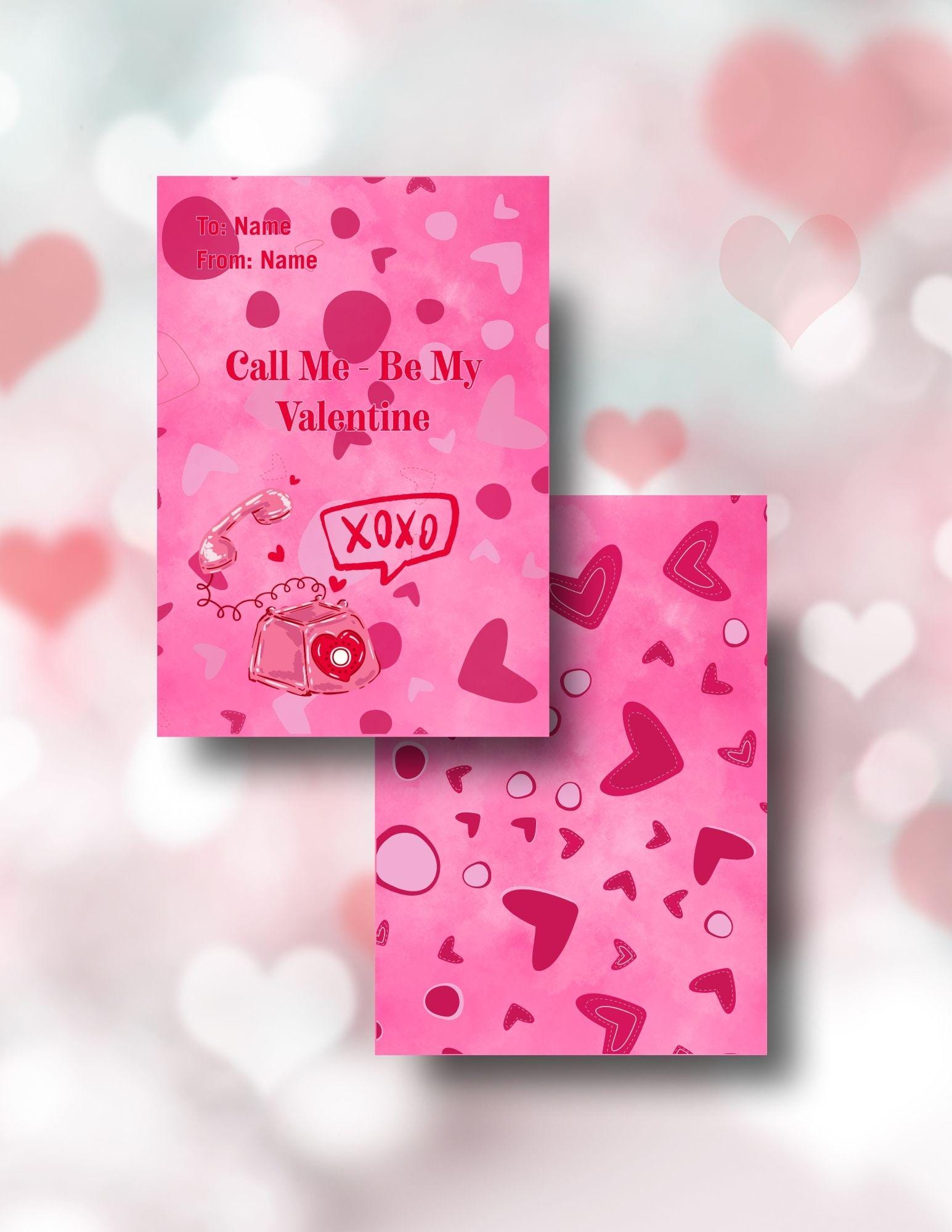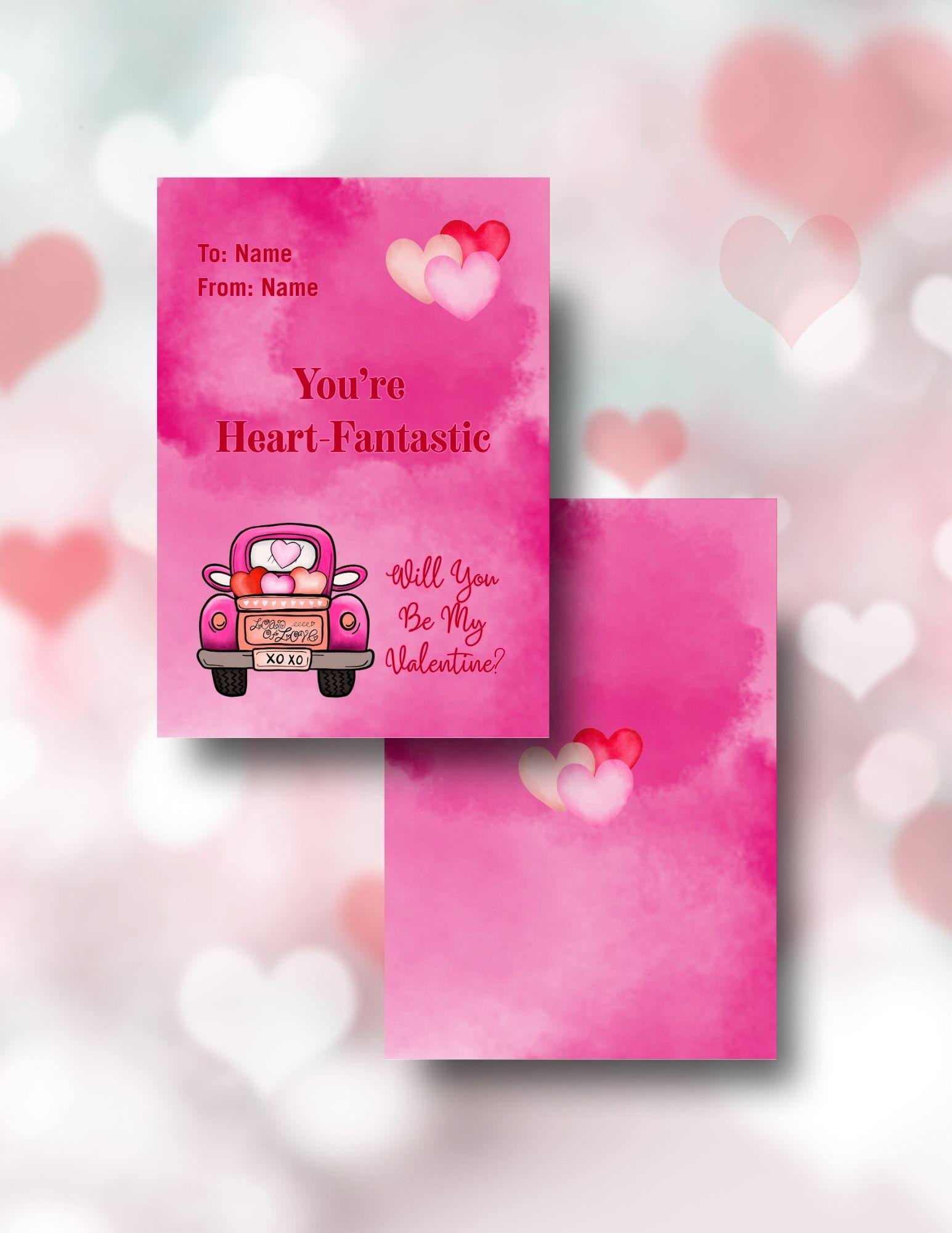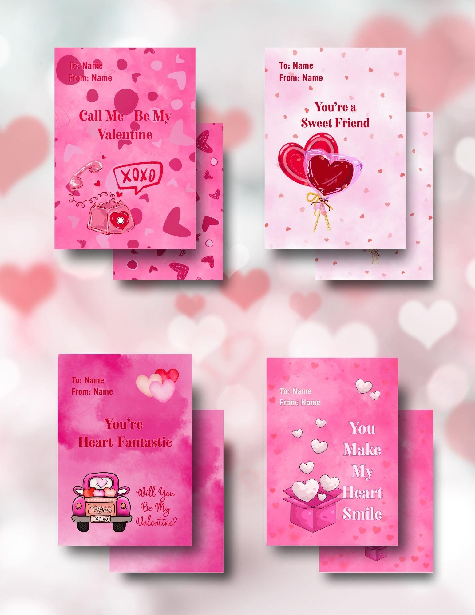 Will you be my Valentines? Hearts, hearts, and more hearts. These Valentine cards are filled with vibrant colors. Pass out these custom 3.5x5 Valentine cards to friends. This Valentine card set includes four different double-sided cards. Place them in goodie bags or envelopes. Edit the "To:" with any name and the "From:" with your child's name.
