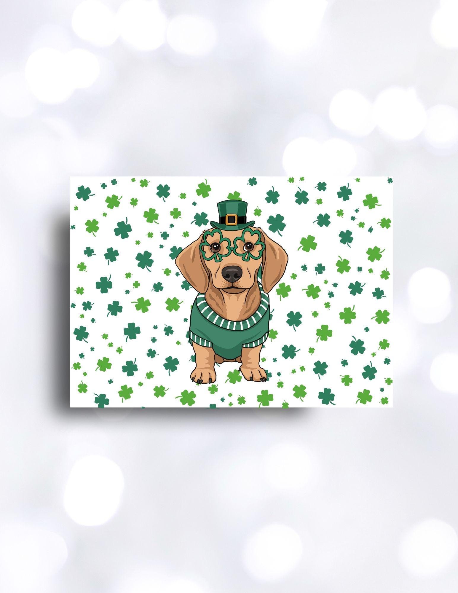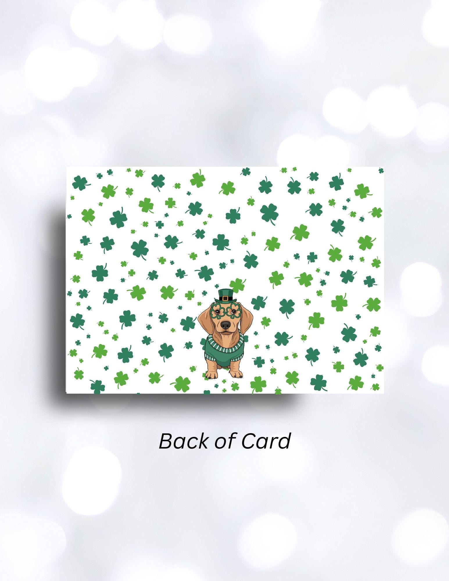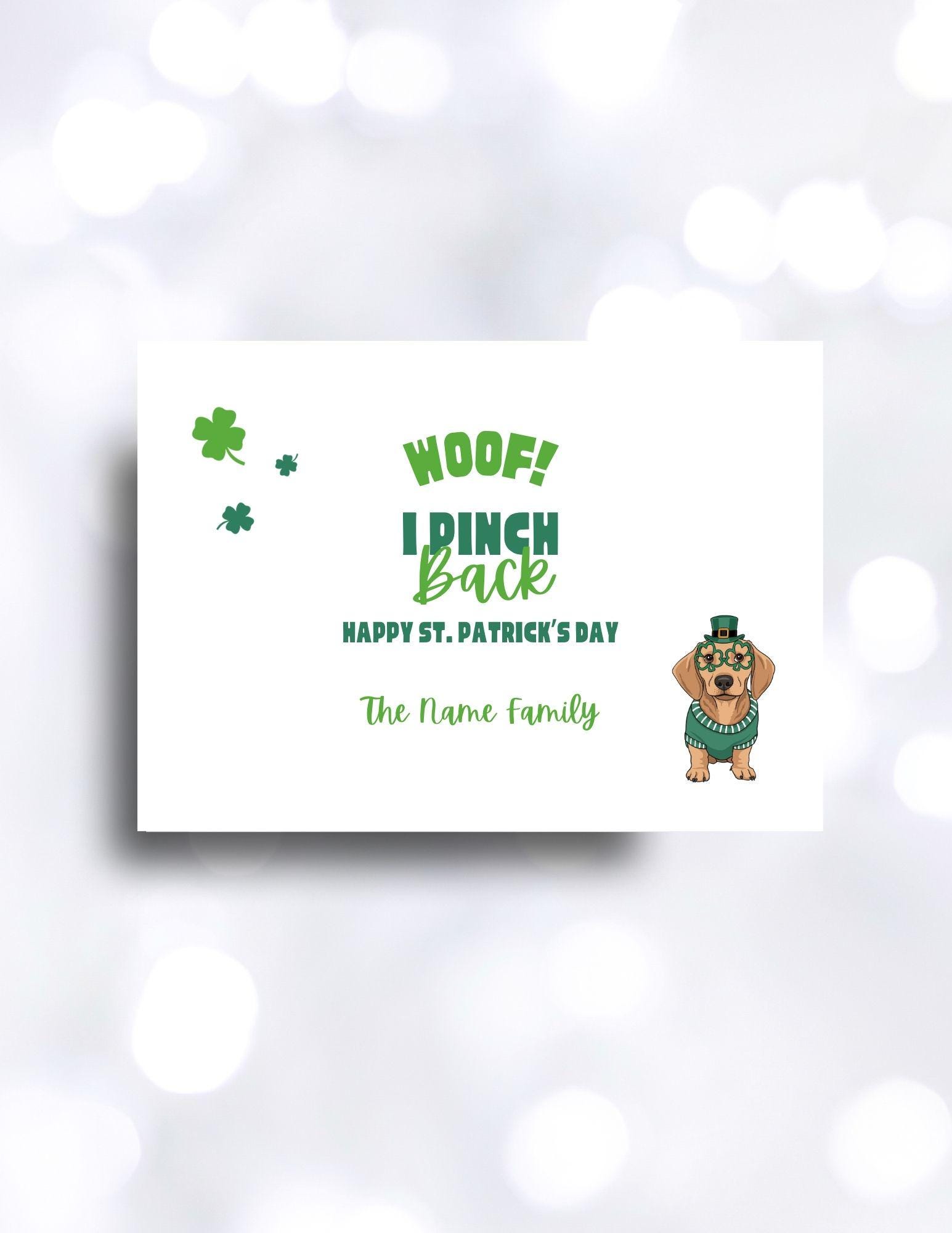 Woof! I pinch back. This silly St. Paddies Day dachshund is ready to celebrate! Green and white fill this card with luck. Send this custom 5x7 digital greeting card to friends and family. Edit with you own signature.
