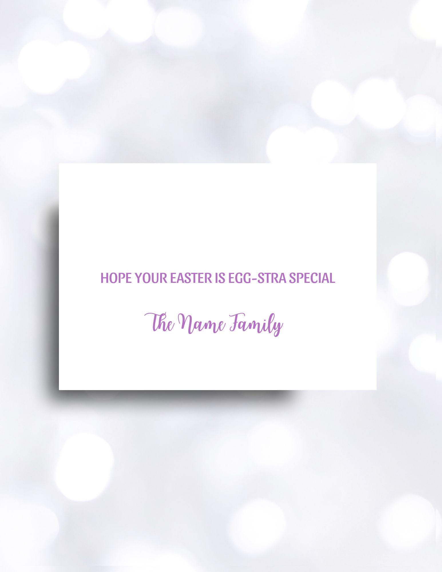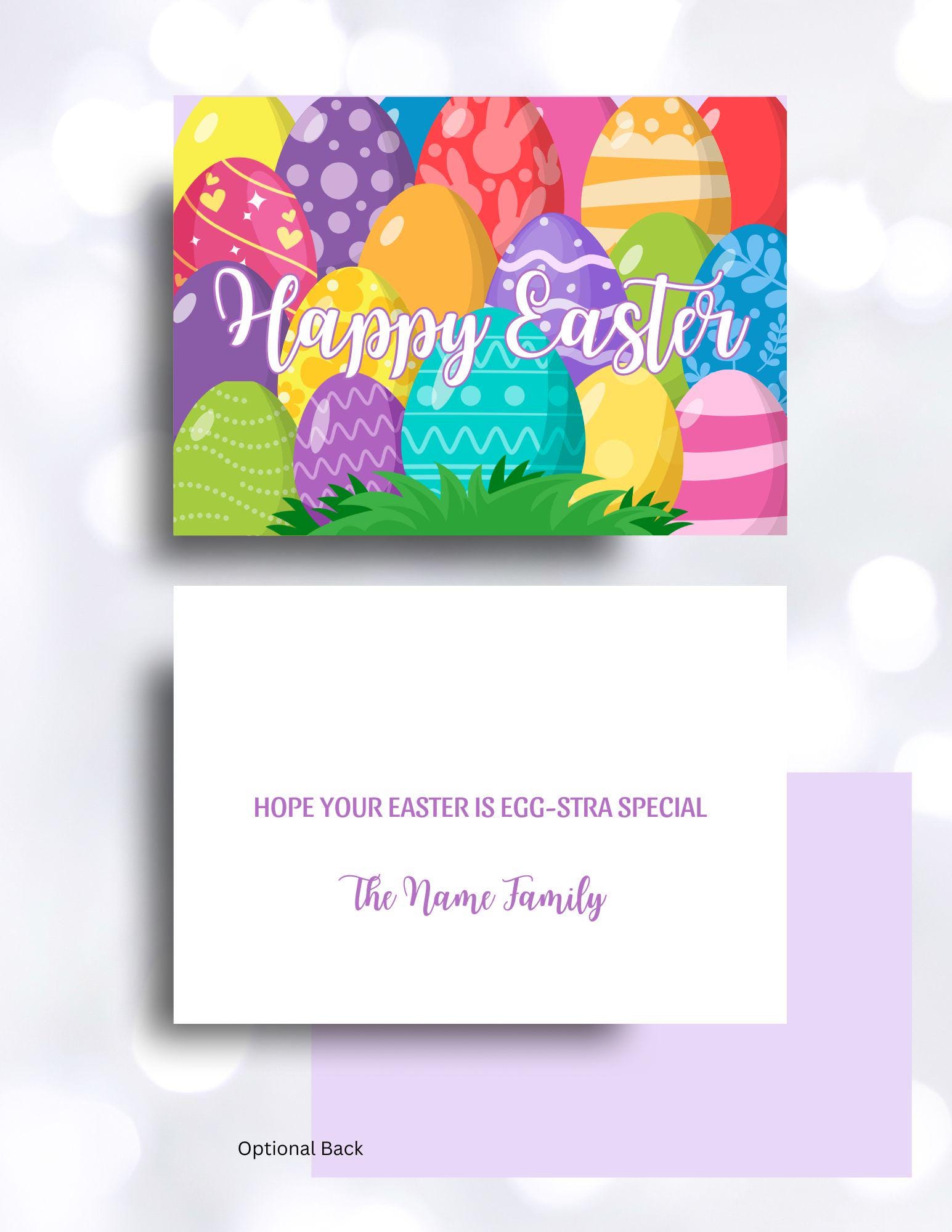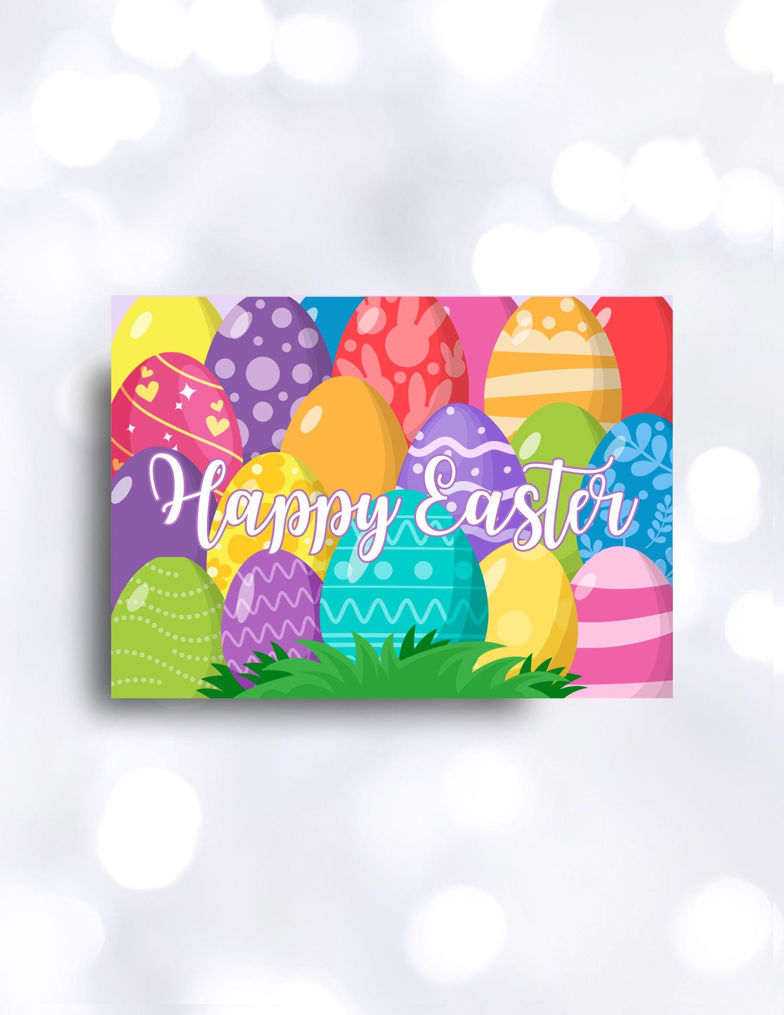 Eggs, Eggs, Eggs! Bright vibrant colorful eggs fill the front if this card. Let family and friends know that you are thinking of them by sending this 5x7 custom Easter greeting card. Edit with your own signature.