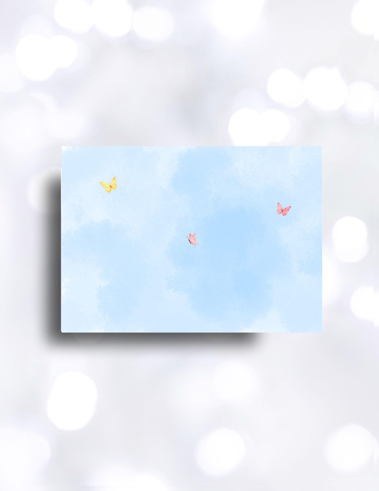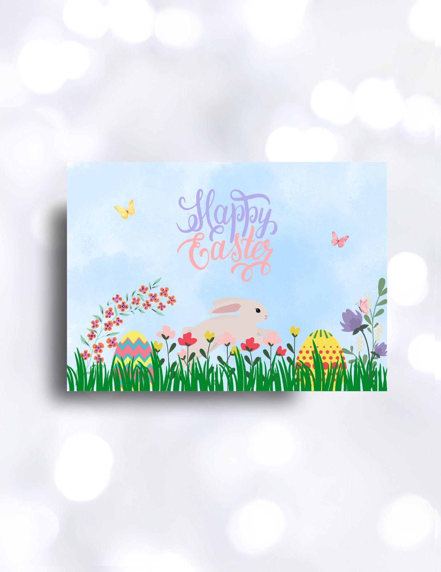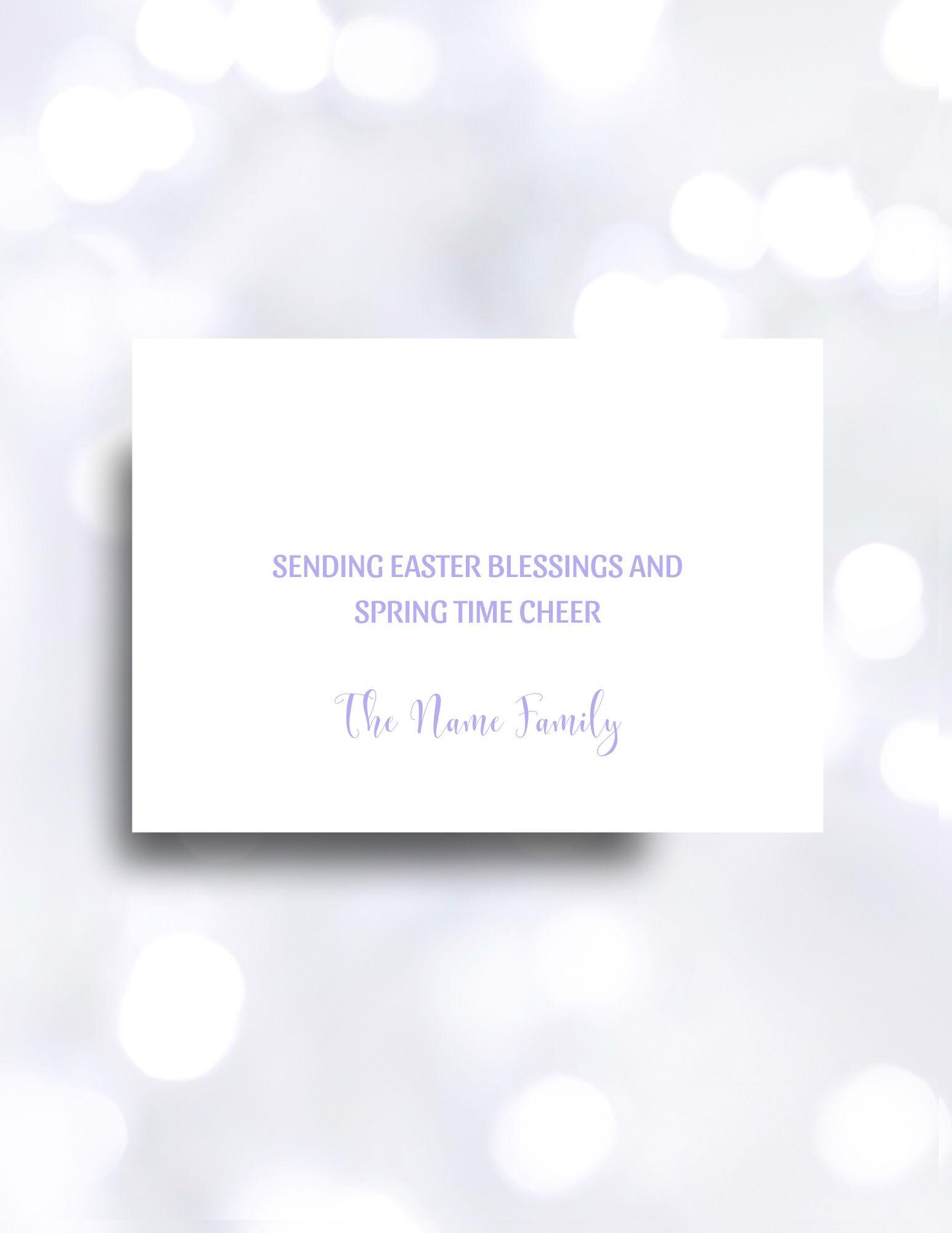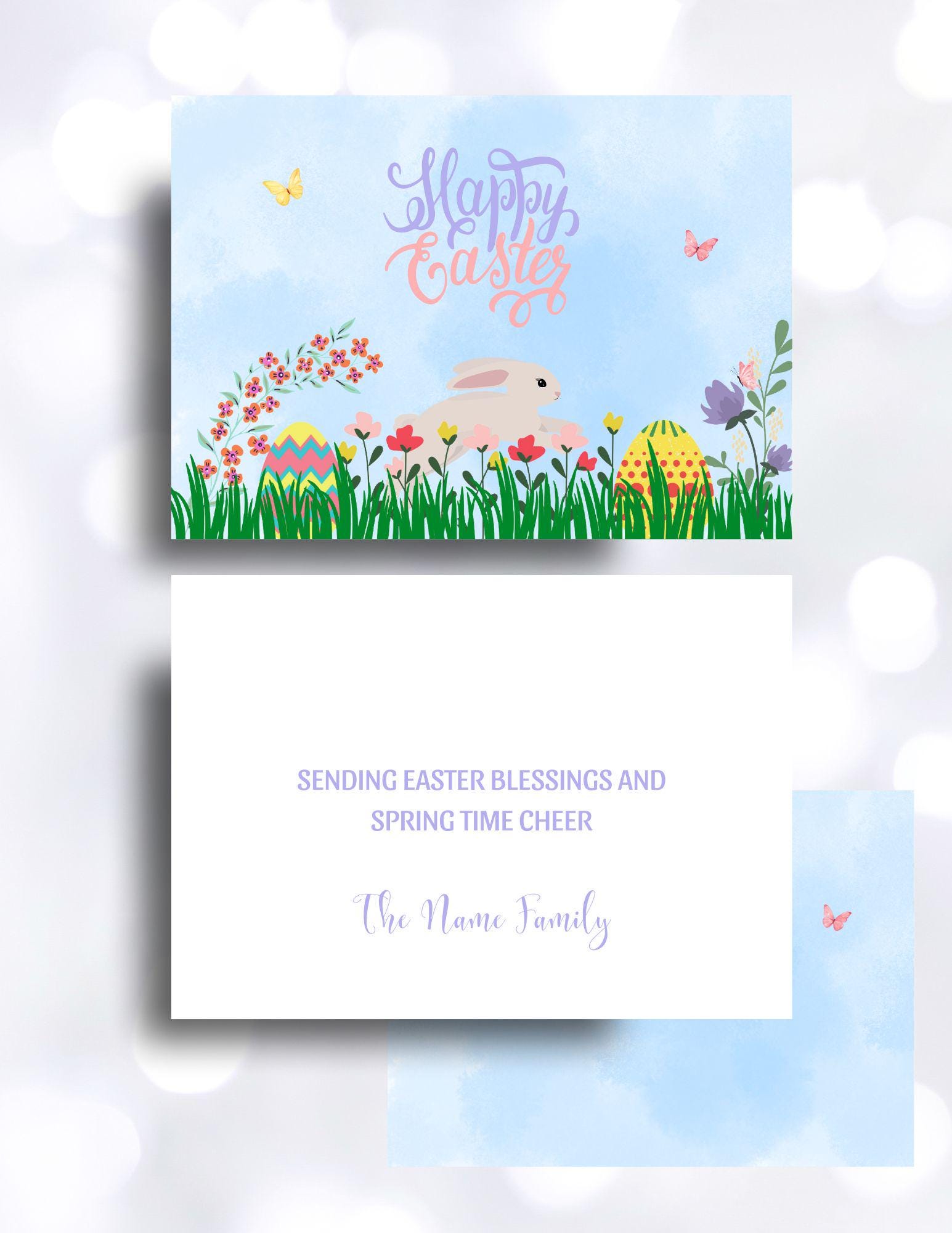 Easter with a touch of spring. Spring is in the air, flowers are growing, butterflies are flying, and Easter eggs and bunnies are hiding. Send friends and family this custom 5x7 Easter greeting card. Watercolor blue fill the front and back background of this card. Edit with your own signature.