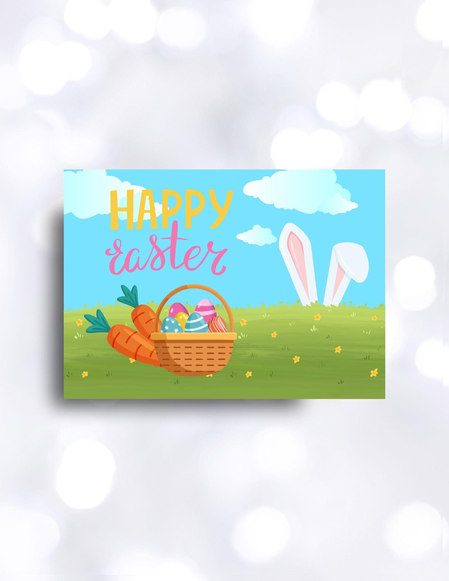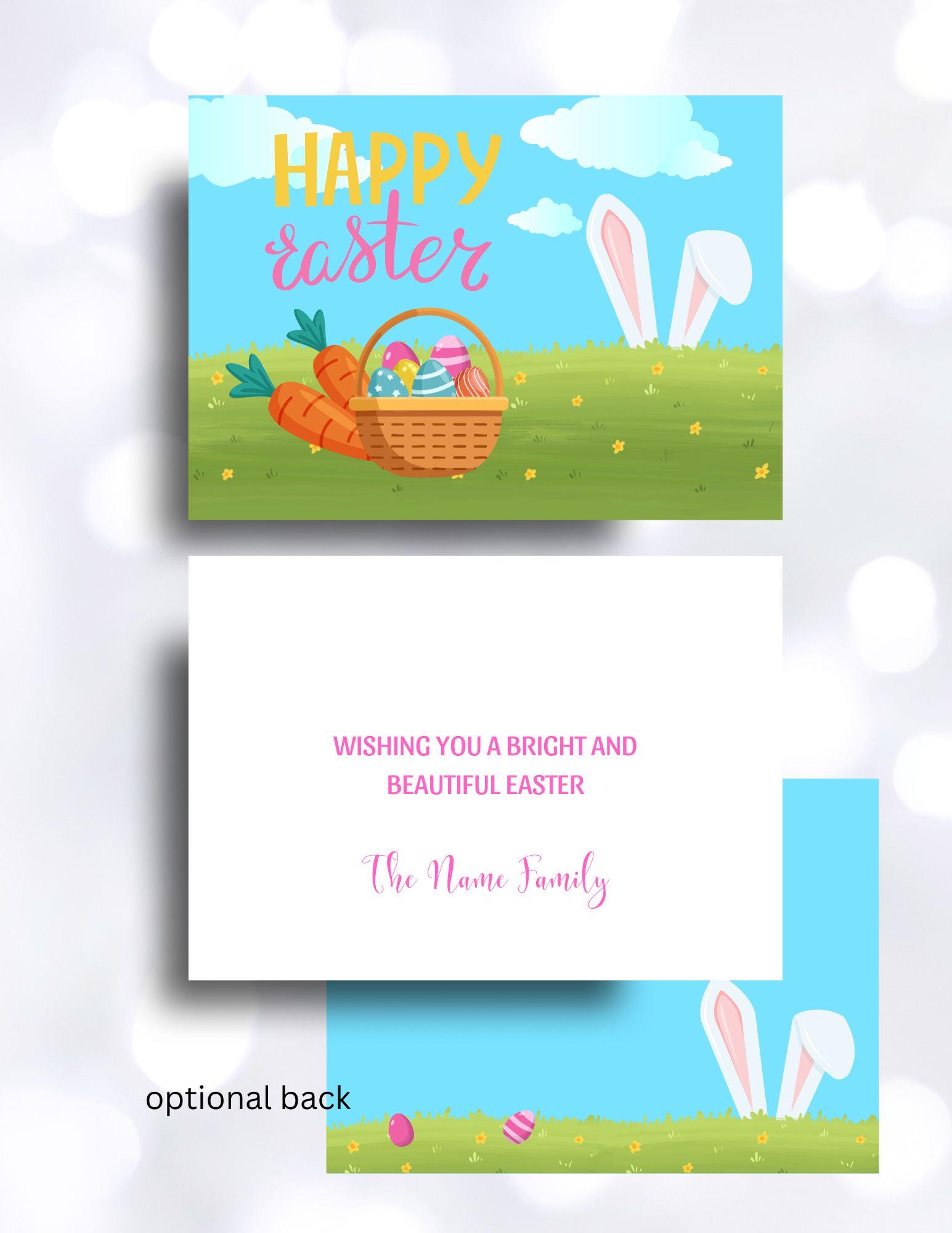 Happy Easter Bunny card has everything Easter. Send friends and family this cute 5x7 custom Easter greetings. Vibrant colors on the front and the back of this digital greeting card. Edit with your own signature.